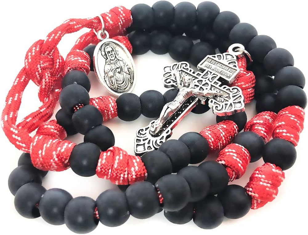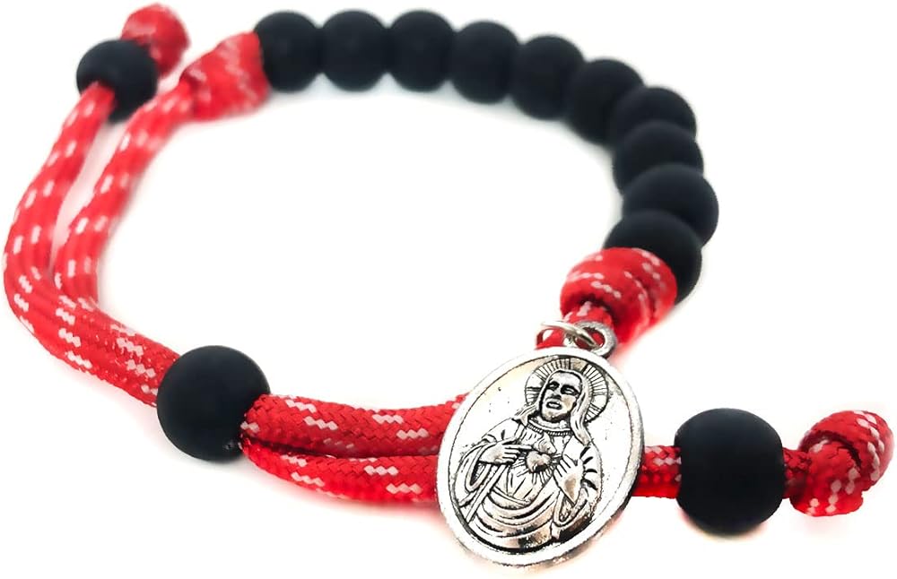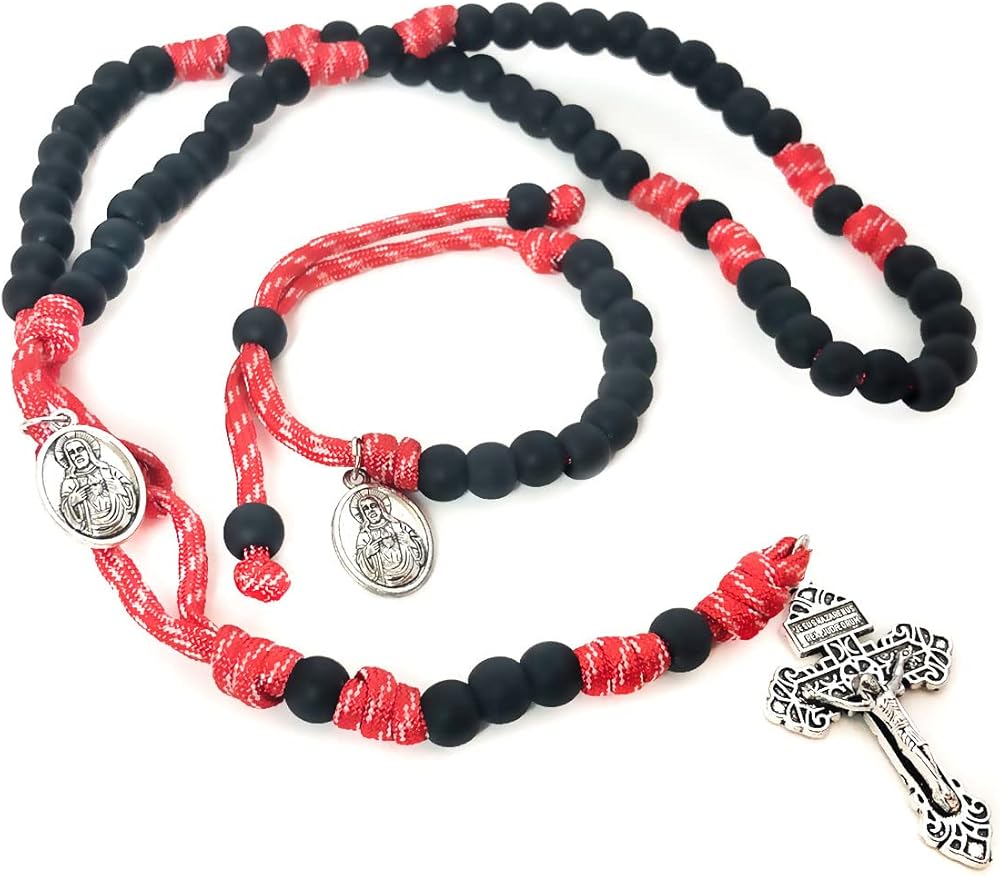 مجموعة مسبحة وسوار باراكورد باللونين الأحمر والأسود على شكل قلب يسوع المقدس - مسبحة كاثوليكية - روزاريوس كاتوليكوس - هدايا كاثوليكية للرجال - ريجالوس كاتوليكوس بارا هومبر