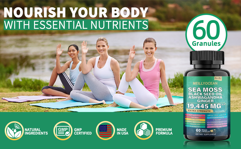 طحالب البحر 7000 ملغ من زيت الحبة السوداء 4000 ملغ من أشواغاندا 2000 ملغ من مزيج الزنجبيل مع الكركم 2000 ملغ من الأرقطيون وفيتامين د3 وفيتامين C مع كلوروفيل ACV ومانوكا بلسانهم والهندباء الصفراء.
