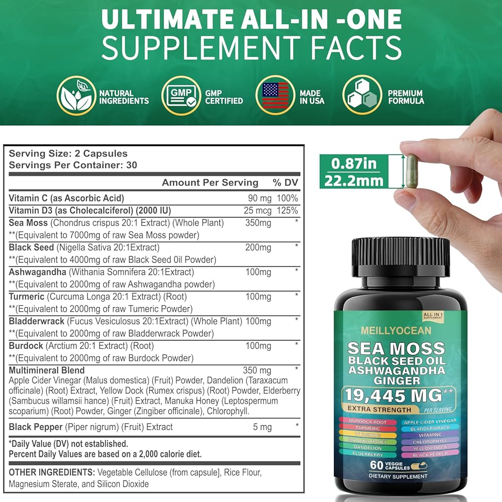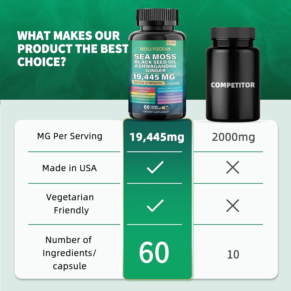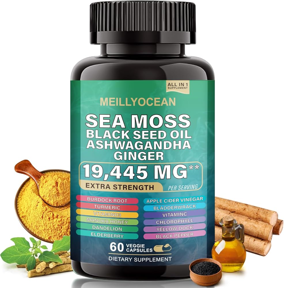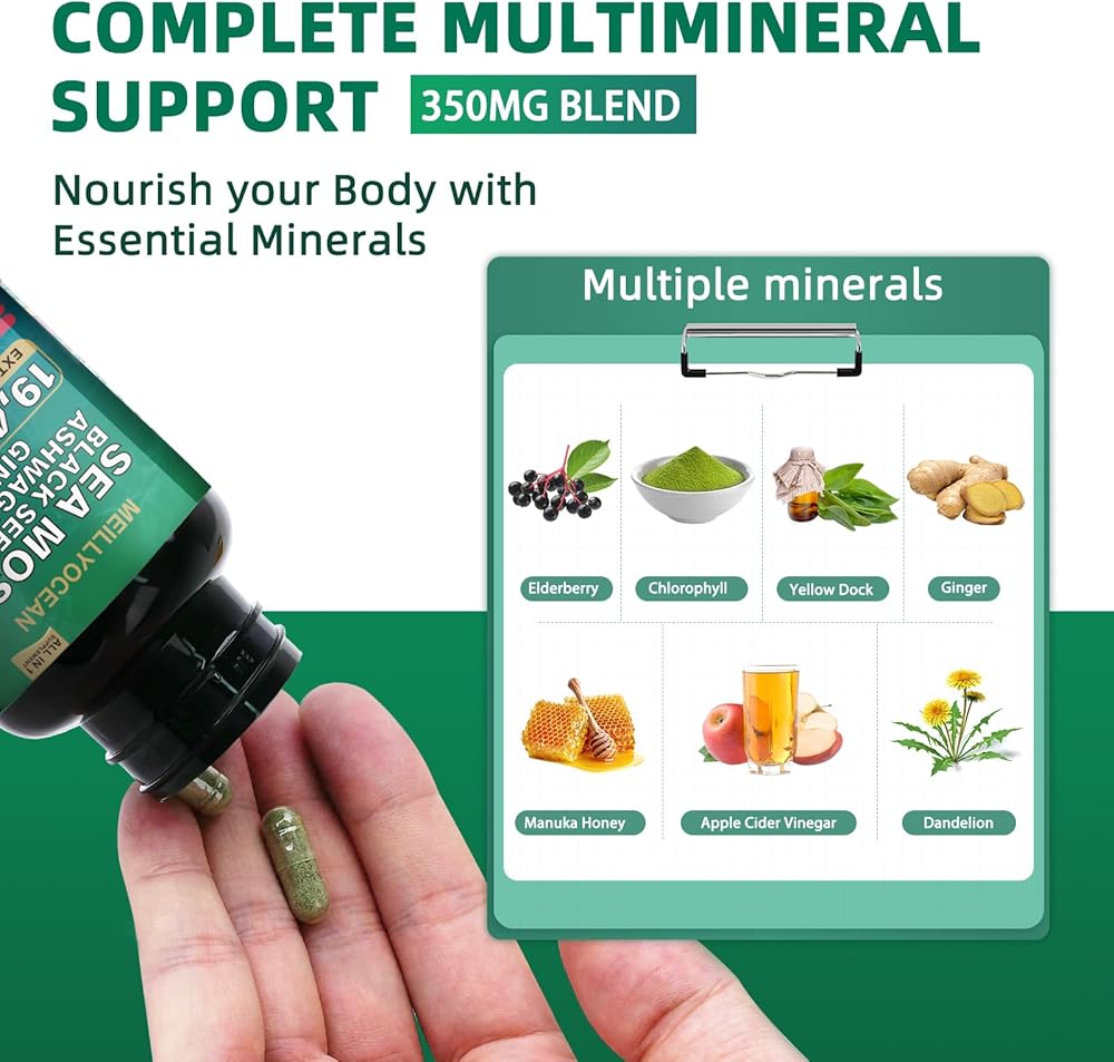 تركيبات متطورة: تركيبة كبسولة طحالب البحر الأيرلندية المتطورة لدينا مصممة لكل من الرجال والنساء. تتميز حبوب Seamoss الخاصة بنا، المعززة بزيت الحبة السوداء لتعزيز صحة الشعر، بمزيج مثير للإعجاب من 15 مكونًا مفيدًا. وهذا يشمل كبسولات الكركمين الكركم، وكبسولات بلاديروراك، وجذور الأرقطيون، والكلوروفيل، والزنجبيل، وغيرها. إنه يوفر تركيبة 16 في 1 الأكثر شمولاً المتاحة، والتي تتضمن طحالب البحر الخام، والبذور السوداء، ومستخلص أشواغاندا، وجذور المثانة، وجذور الأرقطيون، والزنجبيل، وكبسولات الكركم.