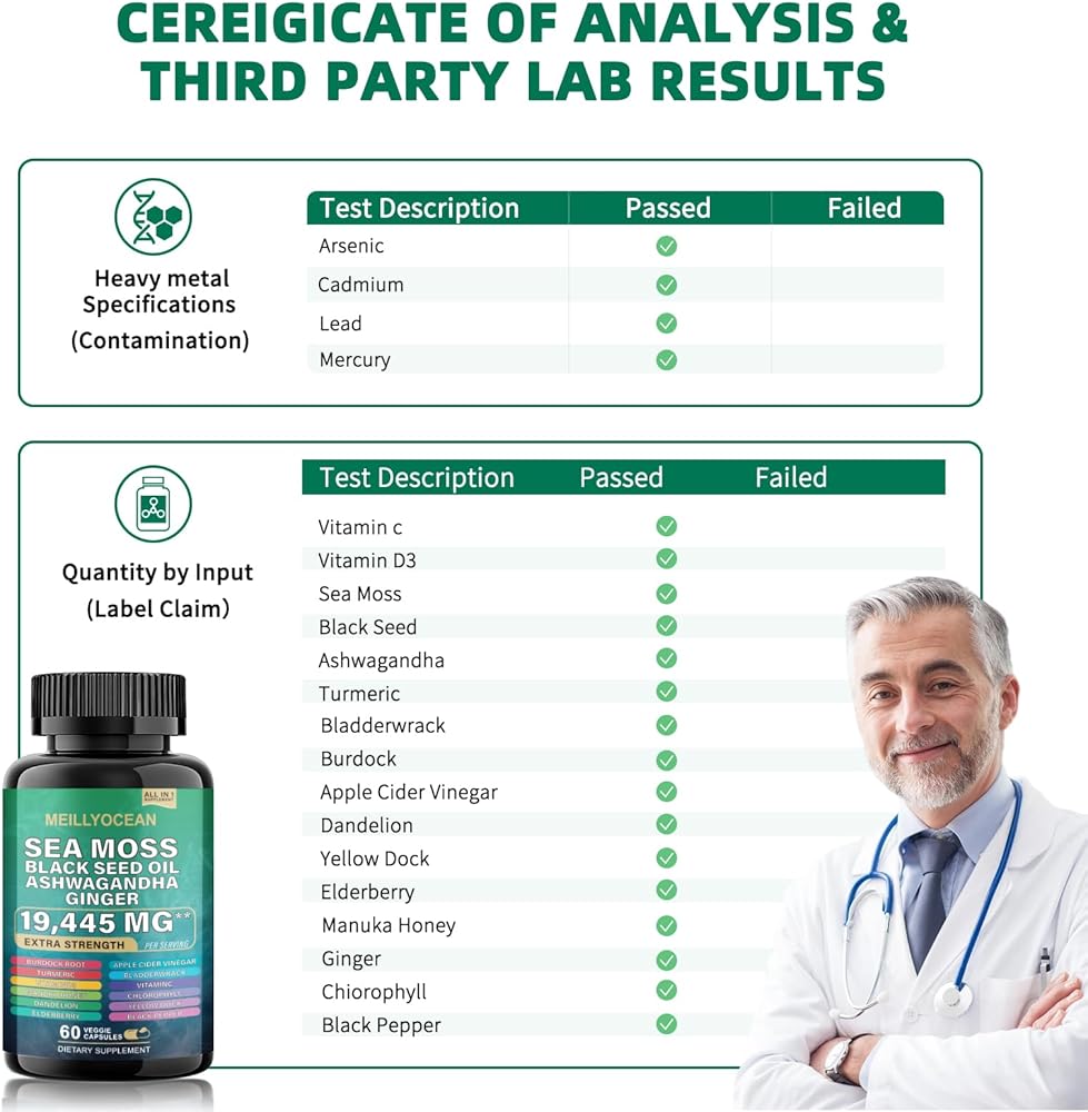التحقق الموثوق به من طرف ثالث: يخضع مكمل طحالب البحر الكل في 1 الخاص بنا لاختبارات معملية صارمة من طرف ثالث في الولايات المتحدة الأمريكية، مما يضمن جودته العالية ونقائه من الملوثات، ويقدم الجوهر الحقيقي لطحالب البحر. كن واثقًا من أن كبسولات طحالب البحر ومكملات أشواغاندا الخاصة بنا مصنوعة بعناية في منشأة مسجلة ومعتمدة في الولايات المتحدة الأمريكية. منتجاتنا خالية من الإضافات أو الحشوات غير الضرورية.