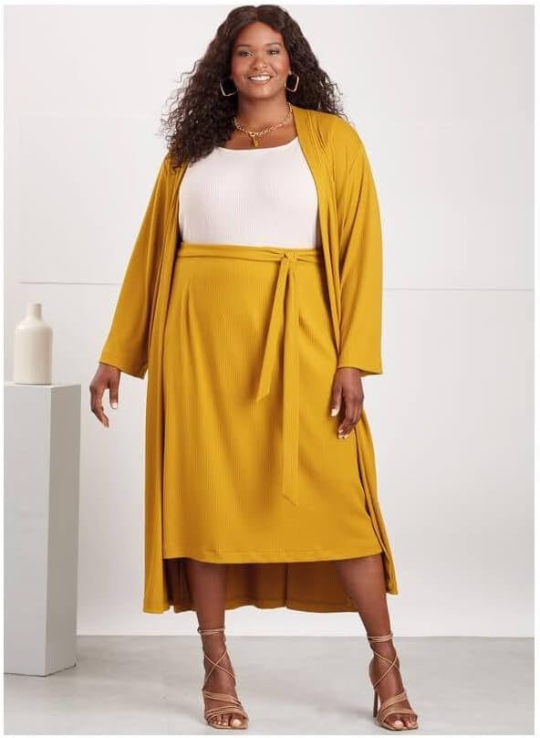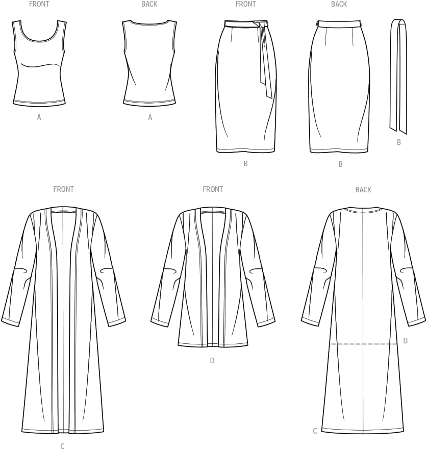Comfortable and stylish skirt, knit top, and cardigan sewing patterns are perfect for any occasion - cardigan comes in two lengths while knit top is sleeveless and skirt includes a self-tie belt