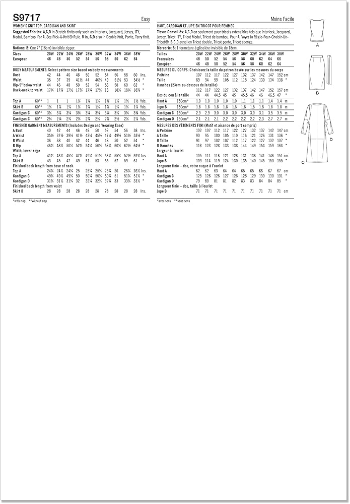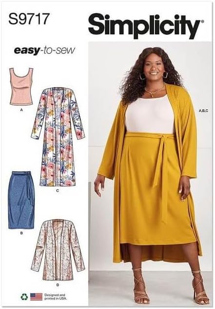 Create cute outfits, complete costumes, and home accessories with Simplicity sewing patterns! Comfortable and stylish knit top, cardigan and skirt outfit is perfect for any occasion! Cardigan comes in two lengths. Knit top is sleeveless and skirt includes a self-tie belt. Simplicity cardigan pattern, top pattern, and skirt pattern packet comes with sewing templates, fabric recommendations, pattern pieces, sizing guides, and instructions. Clothing patterns are for women's sizes 20W-22W-24W-26W-28W. Simplicity patterns are proudly printed in the U.S.A.