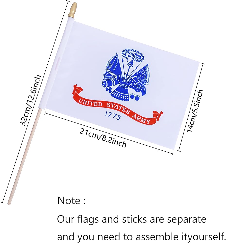 • الحجم والجودة - أعلام عصا الجيش الأمريكي مقاس 5.5 × 8.2 بوصة، عصا خشبية مقاس 12.6 بوصة، عبوة من 12 قطعة.