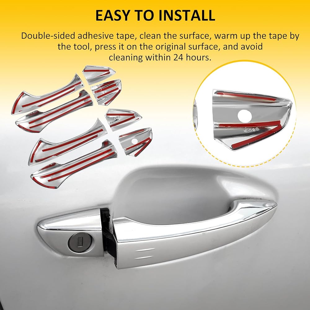 سهل التركيب: تركيب سهل "اللصق" - يأتي مع شريط 3M، وأغطية مقبض الباب الخارجي تلتصق ببساطة بمقبض باب سيارتك بشريط على الوجهين، ولا تسبب ضررًا لسيارتك. لا تتردد واستمتع بنفسك دون أي عبء.