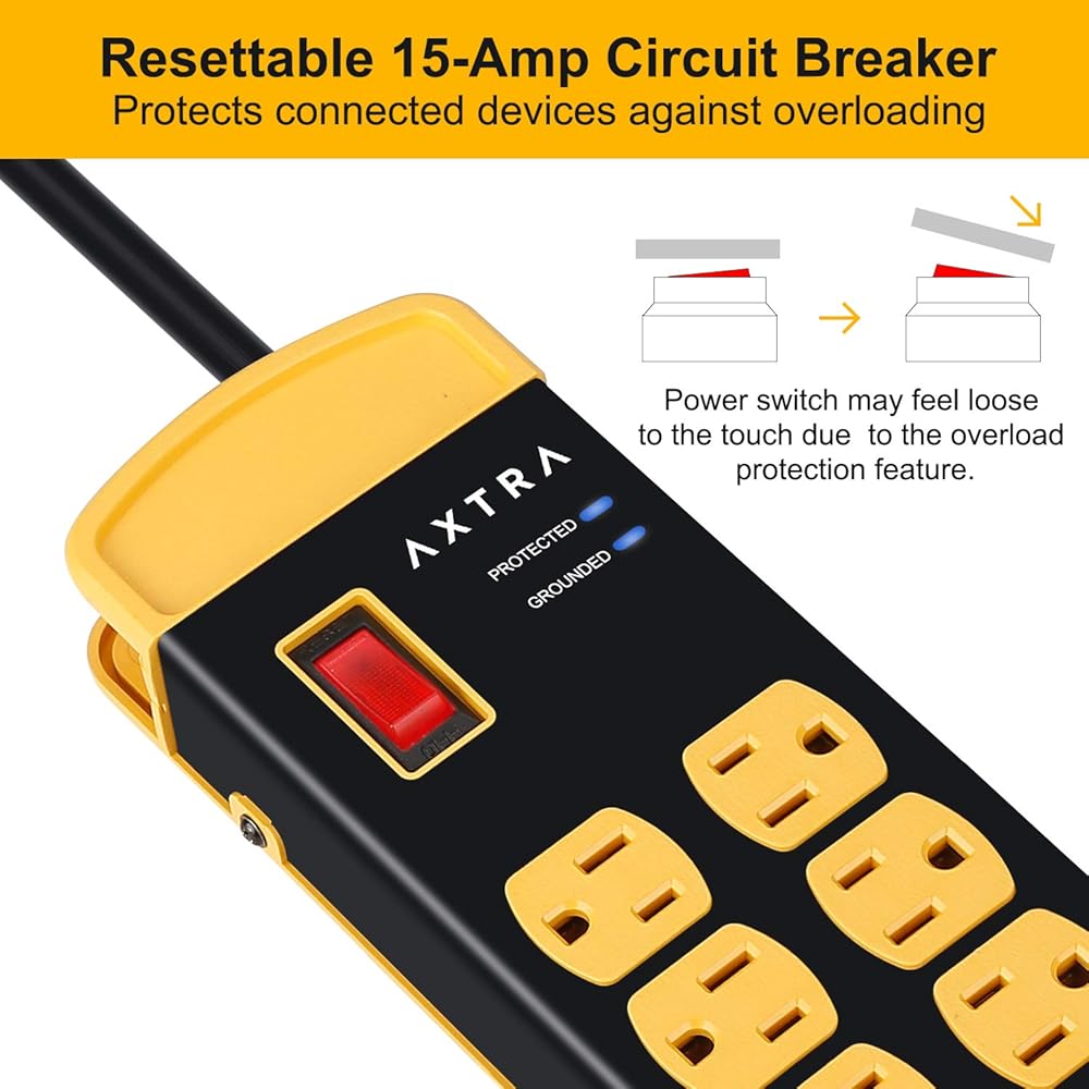 【قاطع دائرة قابل لإعادة الضبط】 قاطع دائرة بقوة 15 أمبير يحمي الأجهزة المتصلة من التحميل الزائد. يتيح لك مفتاح التشغيل/الإيقاف المضيء الرئيسي معرفة ما إذا كان شريط الطاقة قيد التشغيل بسهولة، بينما يحمي قاطع الدائرة الكهربائية بقدرة 15 أمبير أجهزتك في حالة التحميل الزائد. (نصائح ودية: انتبه إلى أن مفتاح الطاقة قد يبدو فضفاضًا عند اللمس، وذلك بسبب ميزة الحماية من التحميل الزائد.)