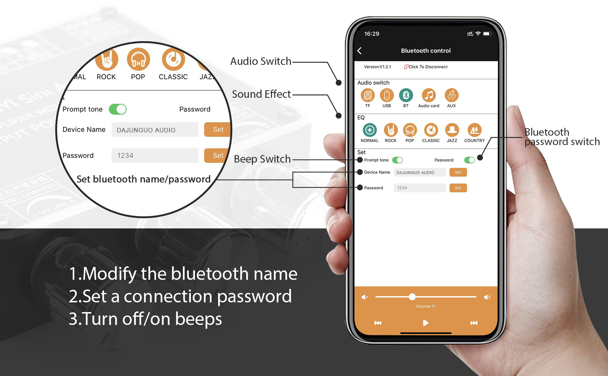 • 【ميزات إضافية! 】من أجل استكشاف أقصى إمكانات لوحة مضخم الطاقة هذه، قمنا بتطوير تطبيق للوحة مضخم الطاقة هذه. يمكنك ضبط التأثير الصوتي للوحة مضخم الطاقة من خلال التطبيق، وتعيين اسم البلوتوث وكلمة المرور للوحة مضخم الطاقة، وحتى تحديد ما إذا كان الصوت الفوري مطلوبًا، وما إلى ذلك.