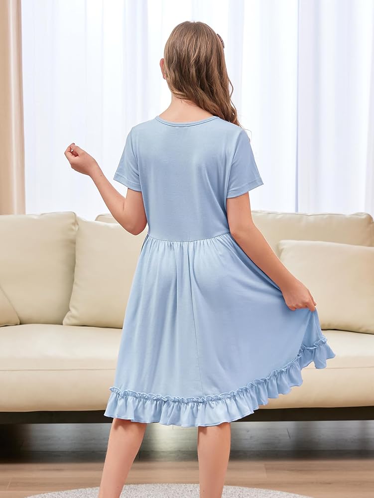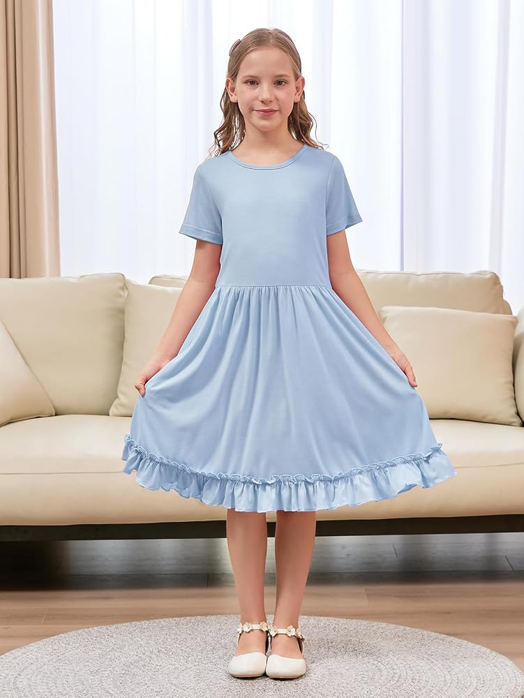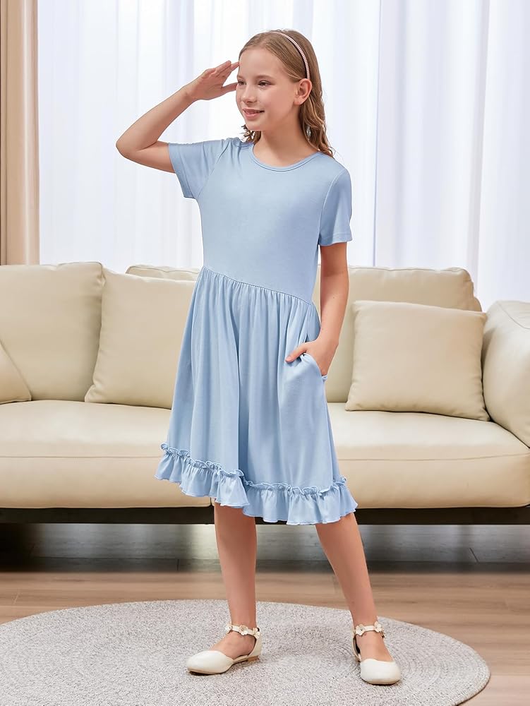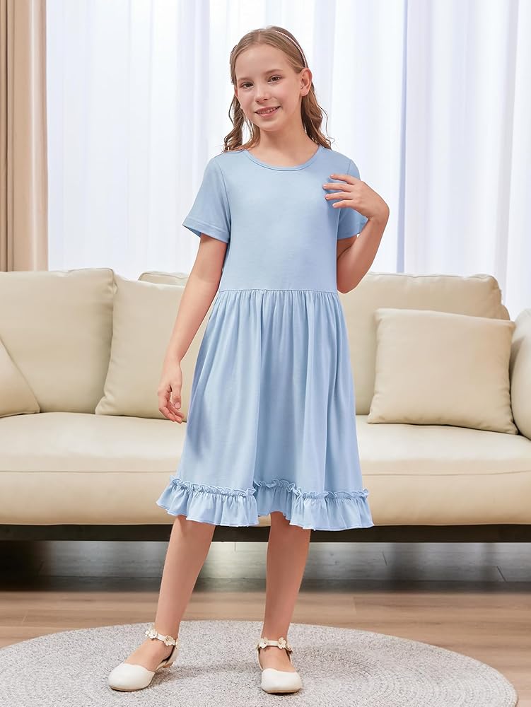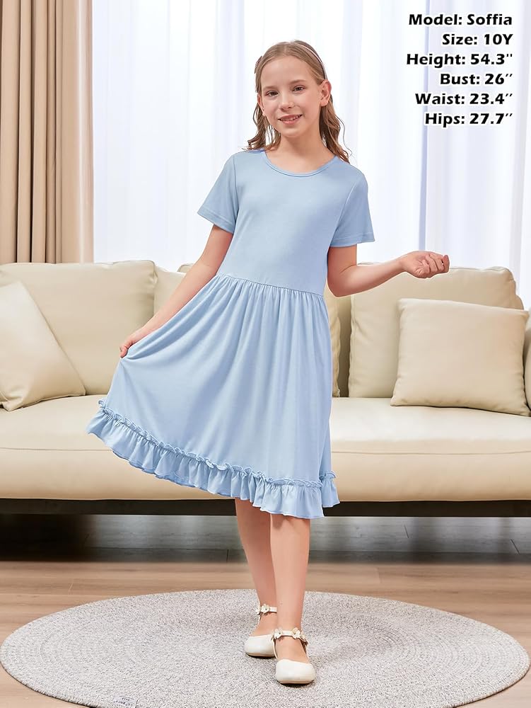 GORLYA Girls Casual Loose A-Line Twirly Ruffle Hem Swing Skater T-Shirt Dress with Pockets Age 4-14Y Details: Introducing the GORLYA Twirl Dress – the perfect addition to your little child's wardrobe. Whether it's a casual outing, a birthday party, school uniform, or a beach vacation, this dress can do it all. Made with top-grade polyester fabric, it offers the perfect blend of softness, breathability, and lightweight comfort. The fashionable ruffle hem adds a charming frilliness to this simple and classic dress, and every twirl becomes a statement of style. The crew neck design elegantly displays the shoulders and neck, while the A-line style subtly highlights the figure, creating an effortless, versatile look. Suitable for any occasion - holidays, parties, or just a casual day out, this stylish, yet comfortable dress is a must-have in your little girl's wardrobe. With GORLYA, style meets comfort in the most adorable way. Dress up your little princess with GORLYA today! Gender: Girl Material: 100 Percent Polyester. Soft, comfy and stretchy knit fabric without pilling. Style: Casual, Fancy, Informal, Semi Formal, Modest, Basic, Kawaii, Pretty, Cute, Classic, Sweet Silhouette: Fit and Flare, A-line, Swing, Skater, Smocked, Flounce, Baggy, Frilly Season: Spring, Summer Dress Length: Midi, Mid Length, Knee Length Sleeve Type: Short Sleeve Neck Style: Round Neck, Crew Neck Pocket: Two Side Pockets Available in age: 4T 5T 6T 7T 8T 9T 10T 12T 14T Occasions: Birthday, Outdoor, Travel Trip, Vacation, Sunday Weekend, Holiday, School, Orchestra, Graduation, Honeymoon, Beach, Prairie, Homecoming, Country, Picture Day, Photoshoot, Work, Rehearsal, Church, Daily Home Wear, etc.