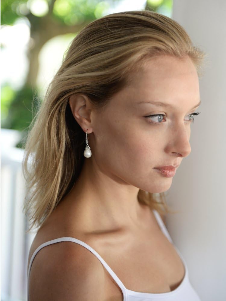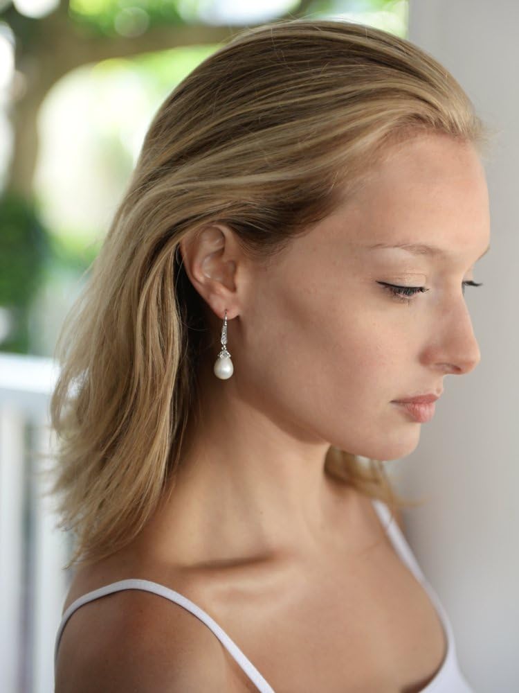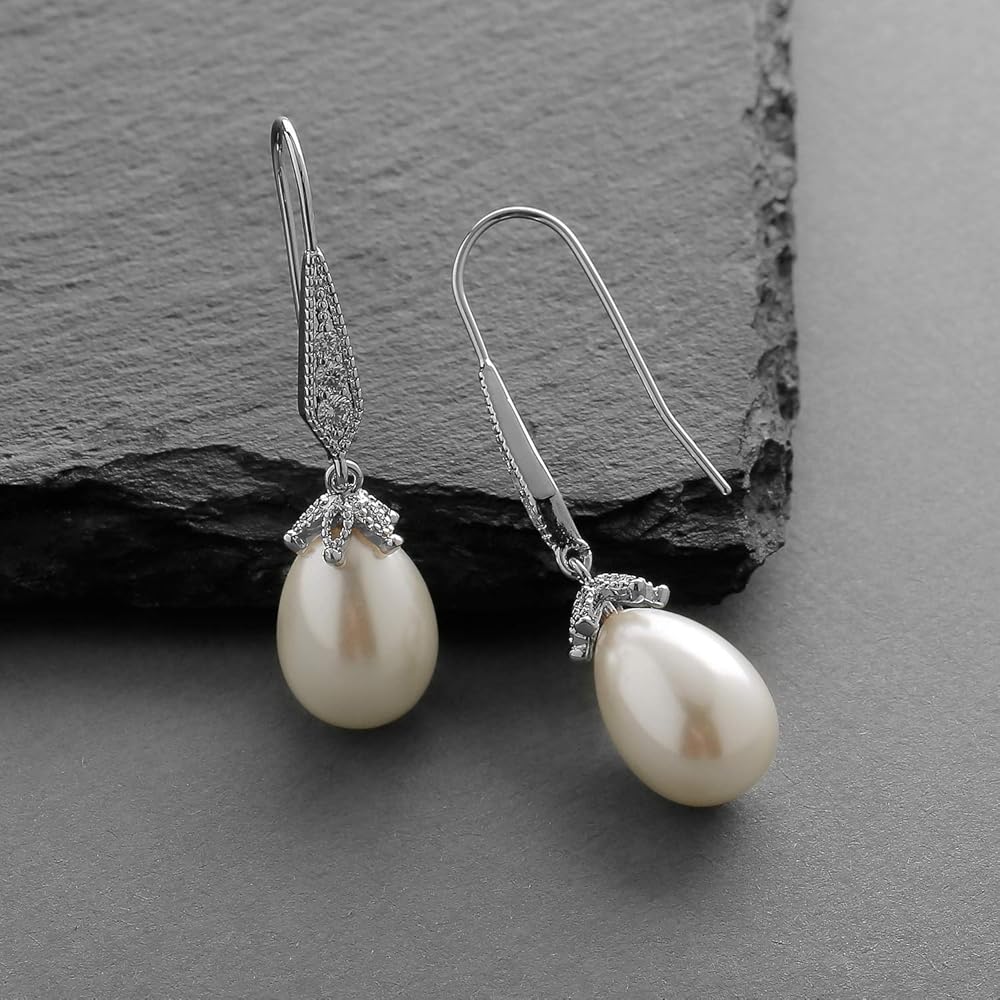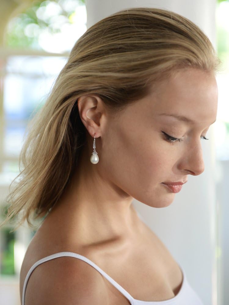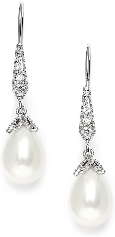 These stunning Light Ivory pearl drop vintage bridal earrings by Mariell feature unique oblong teardrops and jewel-encrusted french wire tops for a wedding day look with unforgettable retro glamour. The lustrous simulated pearls dangle from decorative antique bead caps plated in genuine Silver Platinum. We love how these earrings seamlessly blend the elegant simplicity of pearls with the intricate details of antique reproduction jewelry. Whether for brides, bridesmaids, mothers of the bride, or wedding guests, these 1 5/8" high earrings will add just the right touch of sophistication. You'll be thrilled with the "dress up" or "dress down" versatility of these lovely cz and pearl drop earrings. After your dressy frocks are neatly tucked back in the closet, wear these lightweight glistening beauties with your business wardrobe or jeans and a sweater for just a subtle splash of sparkle. We promise you'll fall in love with these customer favorite pearl dangles. Treat yourself or someone you love to some seriously gorgeous "Breakfast At Tiffany's" glamour with the look of fine jewelry.