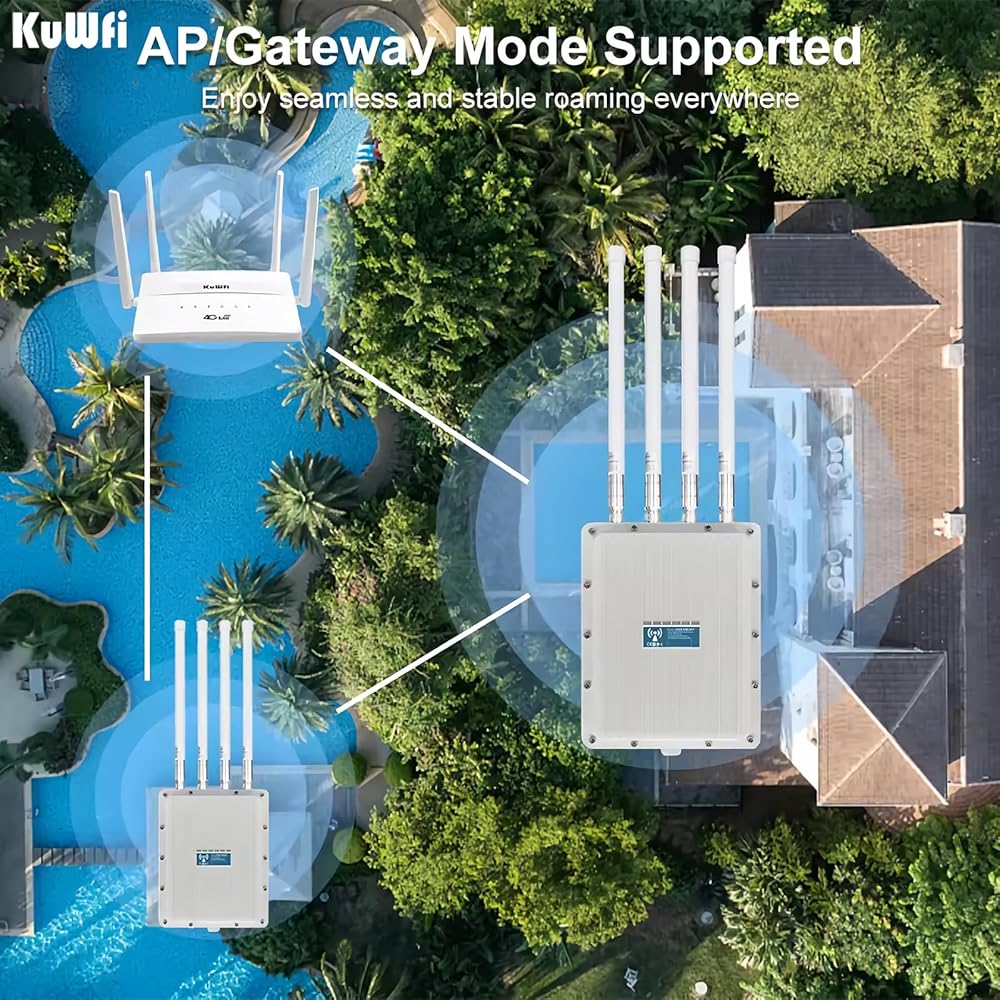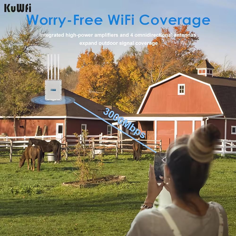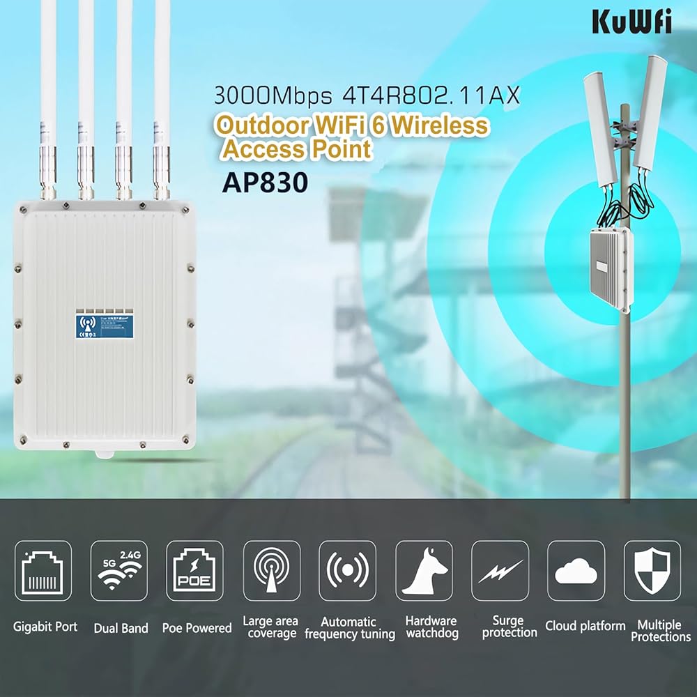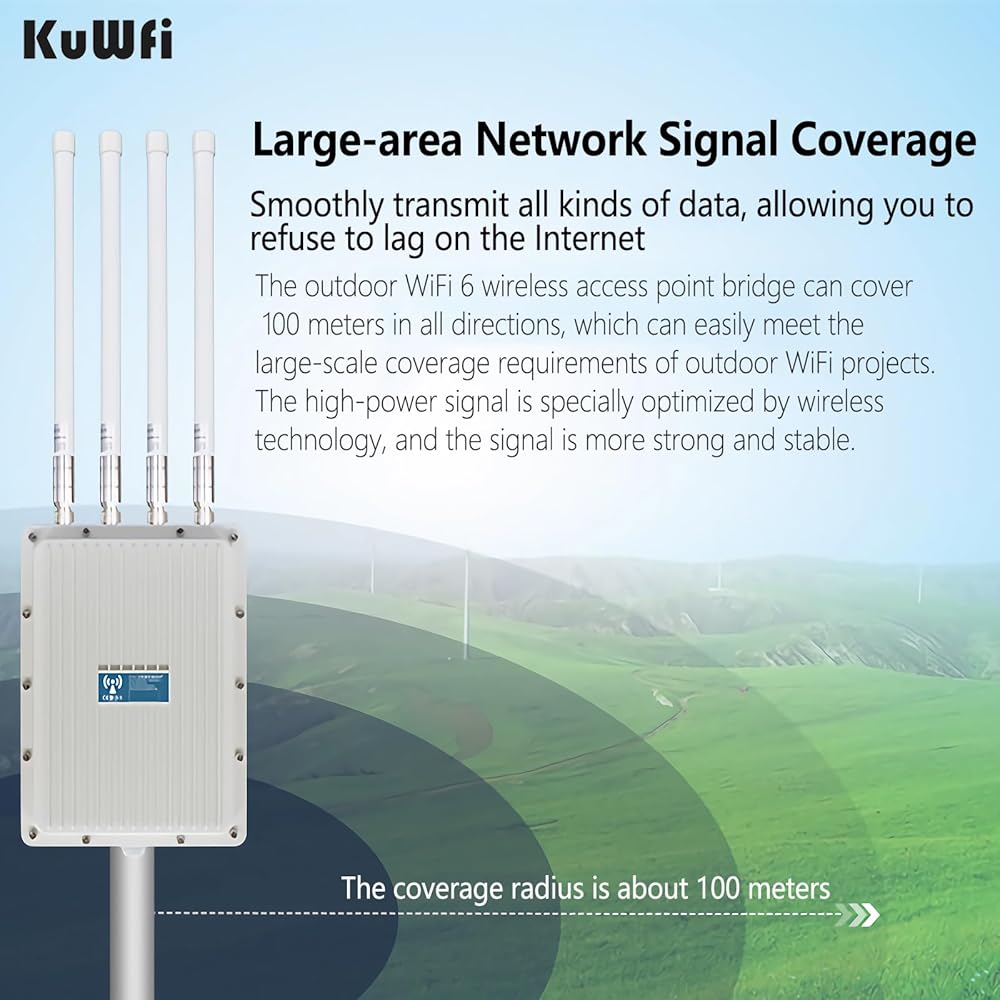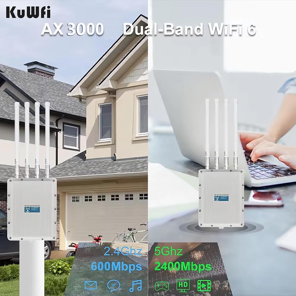 KuWFi AX3000 خارجي واي فاي 6 موسع طويل المدى، جسر نقطة وصول لاسلكي خارجي مزدوج النطاق مع 4 هوائيات عالية الكسب، يعمل بو، منفذ جيجابت، يدعم MU MIMO، تجوال سلس، وصول سحابي