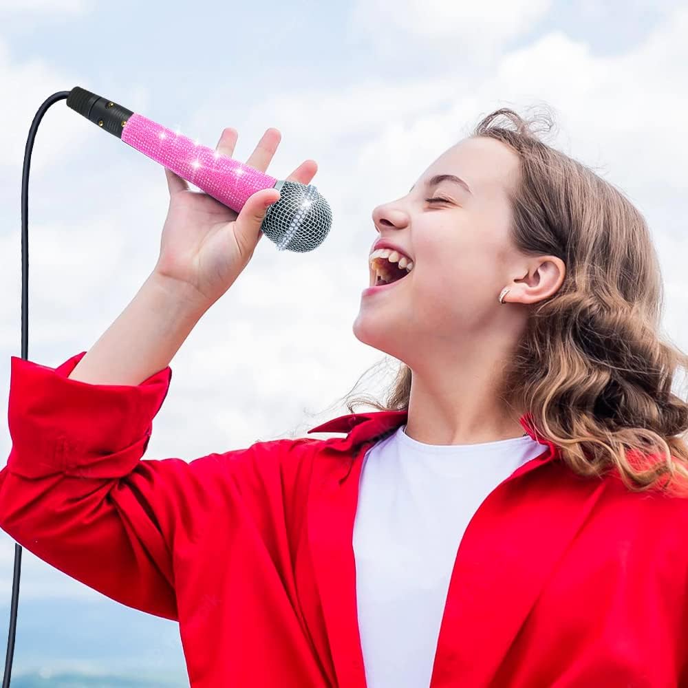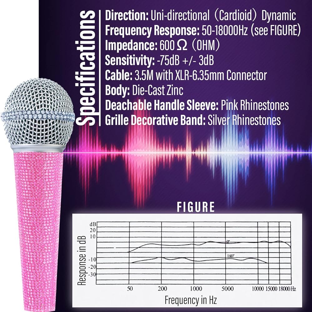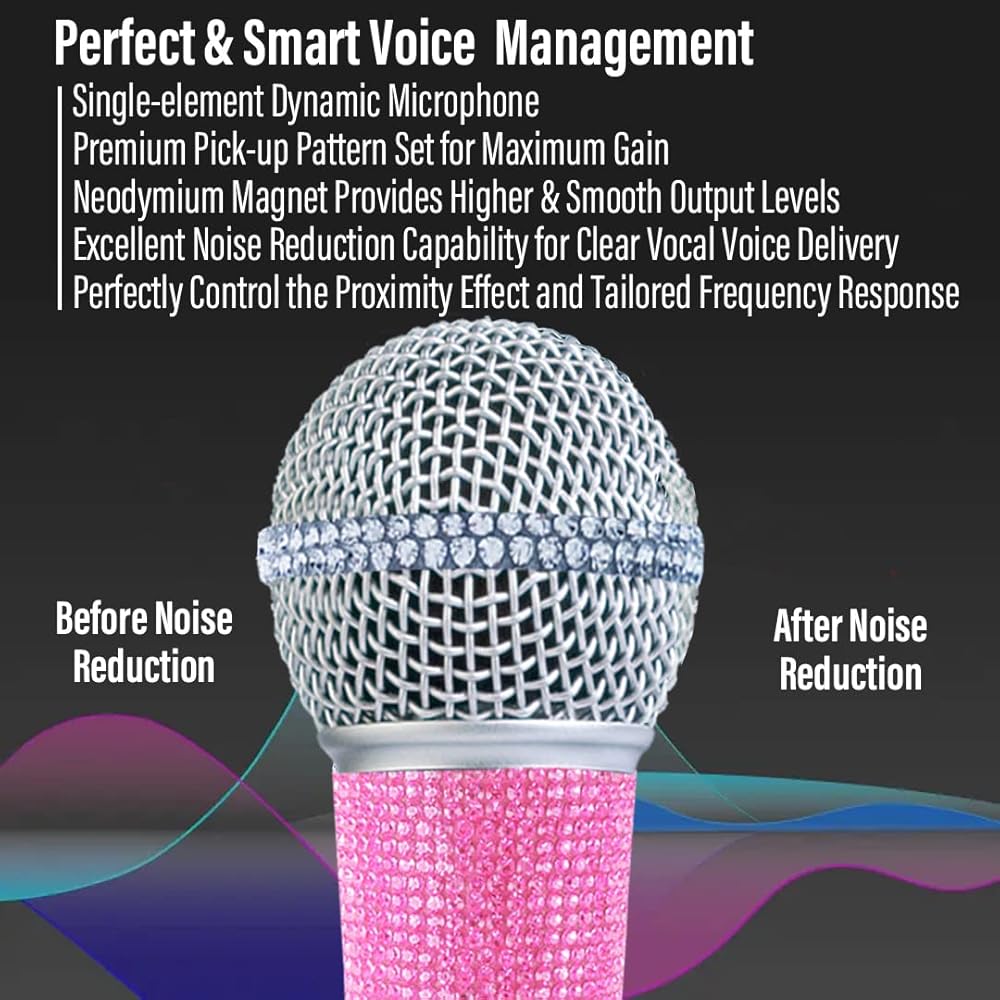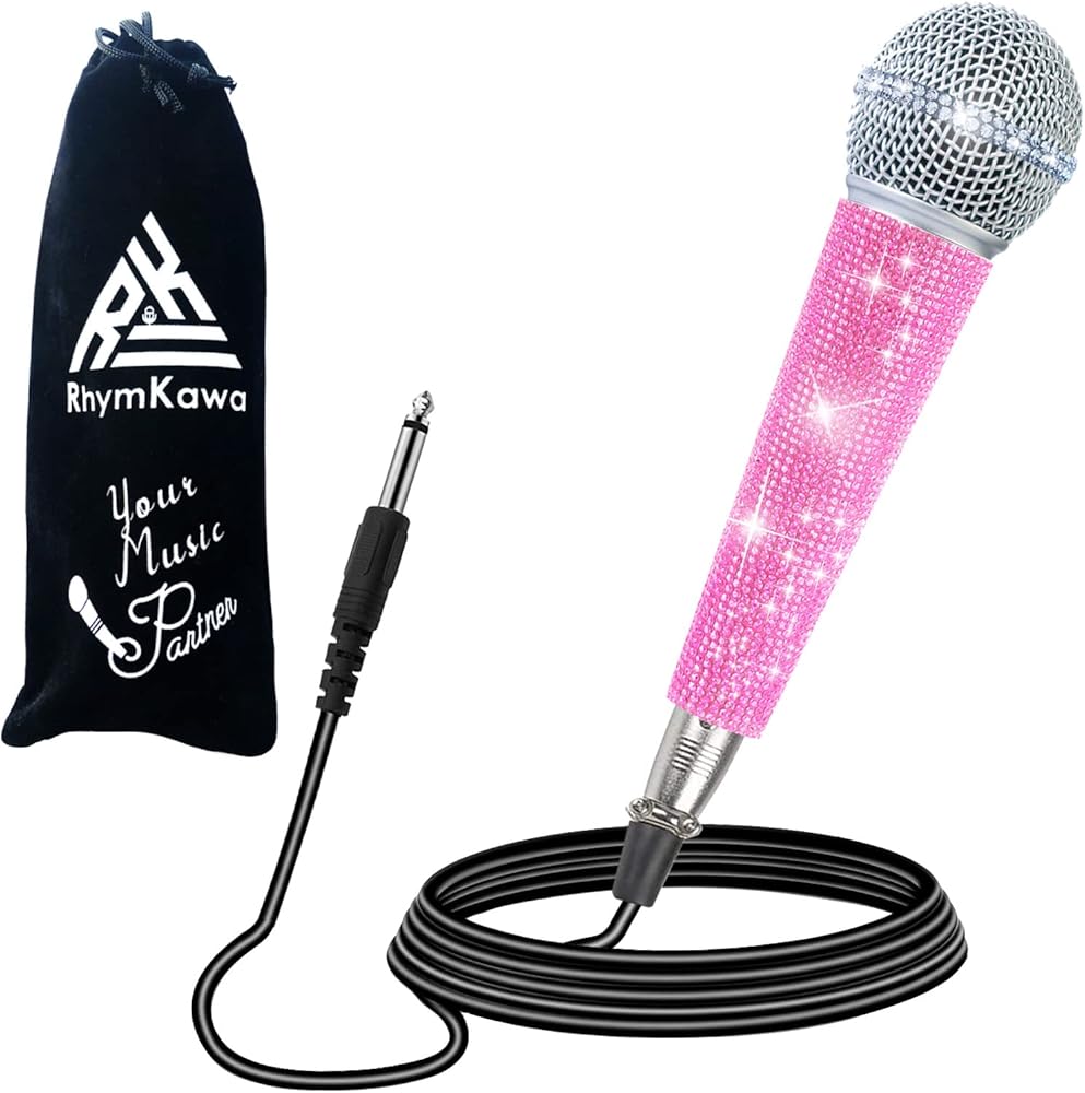 ميكروفون سلكي بلون بينك RB58 مع كيبل XLR 3.5 متر مع جهاز غناء كاريوكي دي جي خلاط نظام مكبر صوت للبالغين والاطفال، ميكروفون صوتي ديناميكي قلبي مع مقبض من حجر الراين اللامع وحزام شبكي مع حقيبة