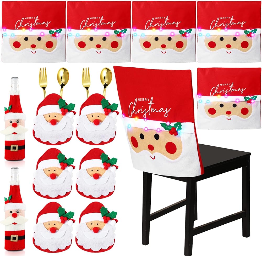 6 قطع LED لعيد الميلاد الخلفي غطاء الكرسي سانتا كلوز 6 قطع لطيفة لعيد الميلاد سترة النبيذ غطاء زجاجة 2 قطعة من اللباد الفضيات لعيد الميلاد جيوب حامل مع أوراق هولي بيري لتزيين مأدبة عيد الميلاد
