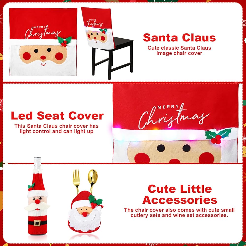 These items are crafted with attention to detail in an exquisite combination. The Santa Claus chair covers, embedded with LED lights, bring a radiant appeal while silverware and wine bottle covers provide a cohesive look.