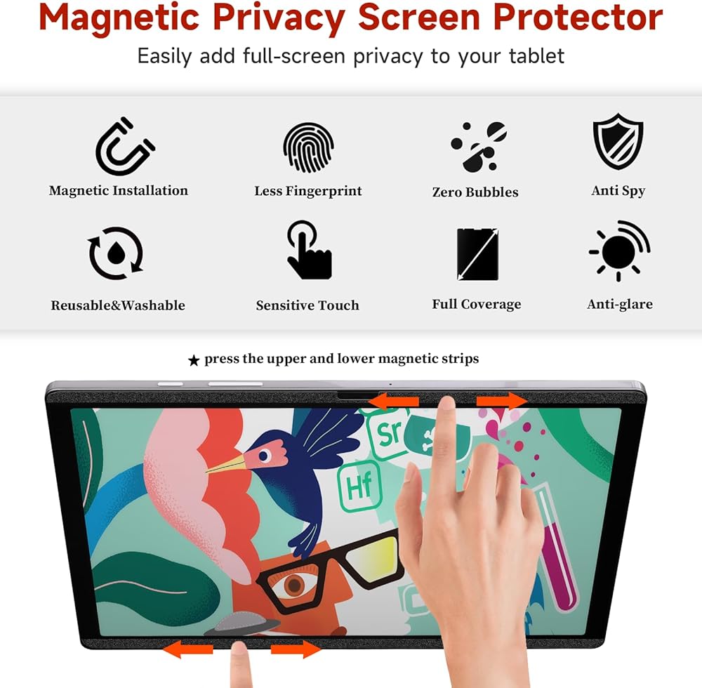 【قابل للإزالة وإعادة الاستخدام】فلتر خصوصية مغناطيسي متوافق مع جهاز Galaxy Tab S7 Plus مقاس 12.4 بوصة مع تصميم كباس مغناطيسي، ببساطة قم بمحاذاته مع إطار الشاشة واضغط بلطف. وهو مثالي لمجموعة متنوعة من الأماكن العامة واجتماعات العمل والمكاتب ذات المخطط المفتوح والمؤسسات المالية والمقاهي والطائرات والقطارات وما إلى ذلك.