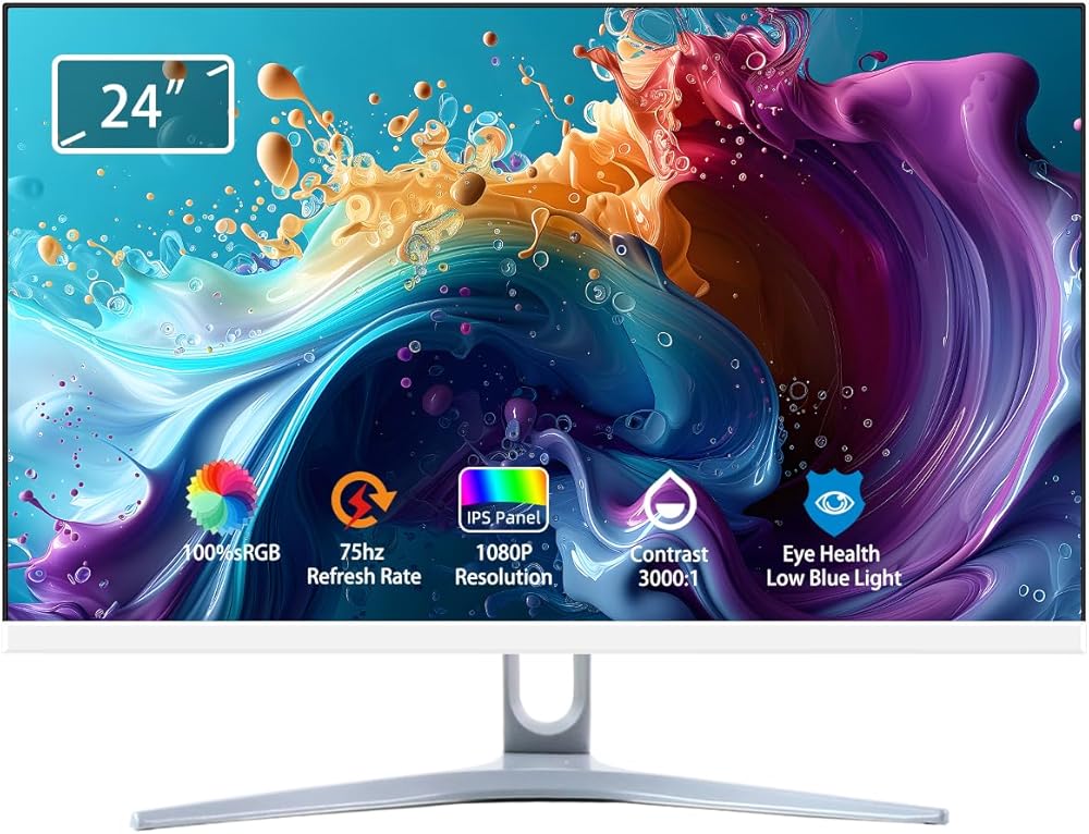24 Inch Computer Monitor, Full HD 1920x1080P LED PC Monitor IPS Display, HDMI VGA Port, Frameless, VESA Mountable, White