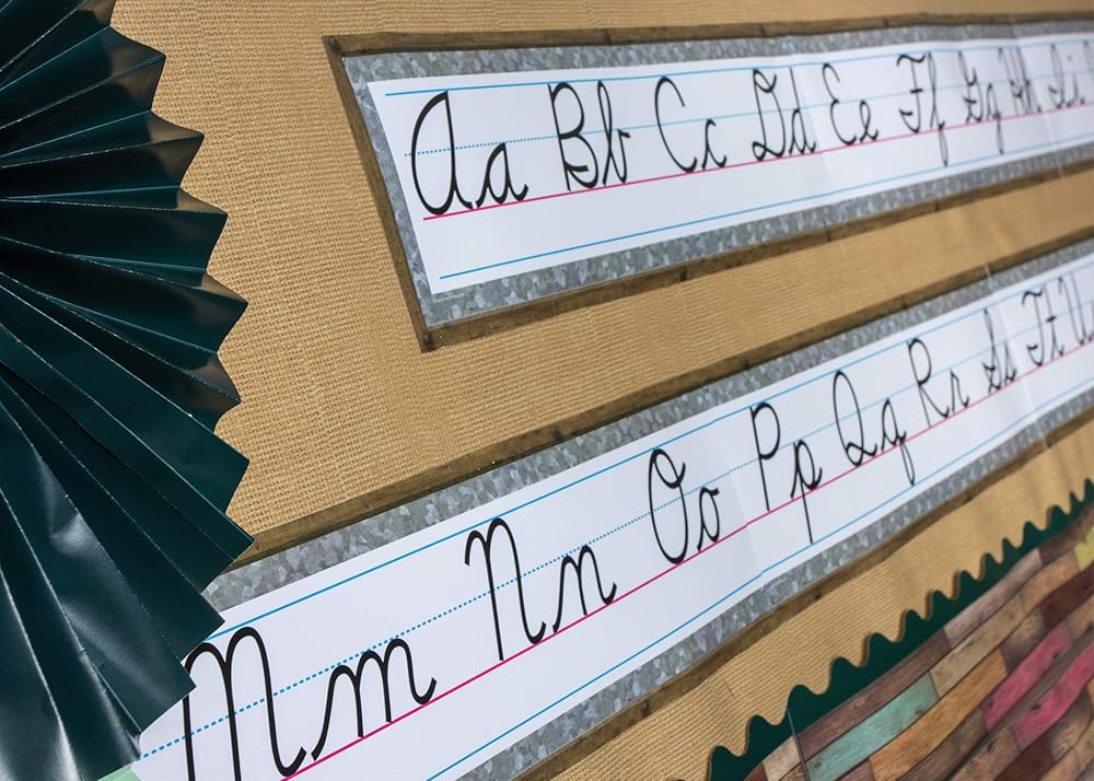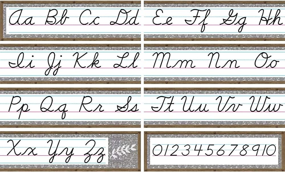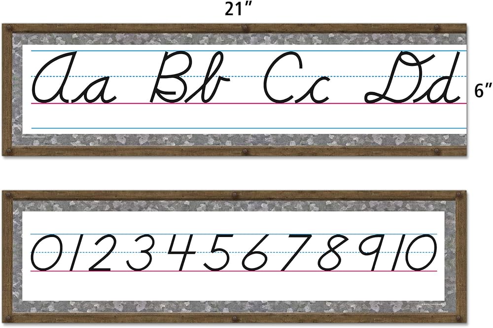 Display the home sweet classroom cursive mini bulletin board alphabet and numbers 0-10 as a handy reference for Young students. The 4-page teacher's guide includes writing tips and a reference Chart that diagrams the steps in writing Each letter. Includes 8 panels For a 14-foot long alphabet line. Shiny, protective coating adds durability. This product is acid-free per industry standards. Each piece is 21" X 6".