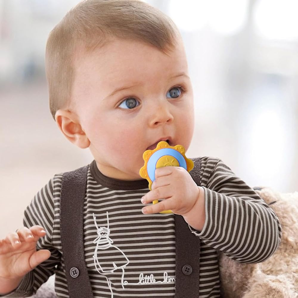 ألعاب تسنين للأطفال من عمر 3 إلى 12 شهرًا، ألعاب حسية، خشخيشة عباد الشمس، عضاضة شخصية للأطفال، ألعاب خشخيشة للأطفال الصغار، ألعاب للرضع، ألعاب تسنين للأطفال تصدر ضوضاء (أزرق)