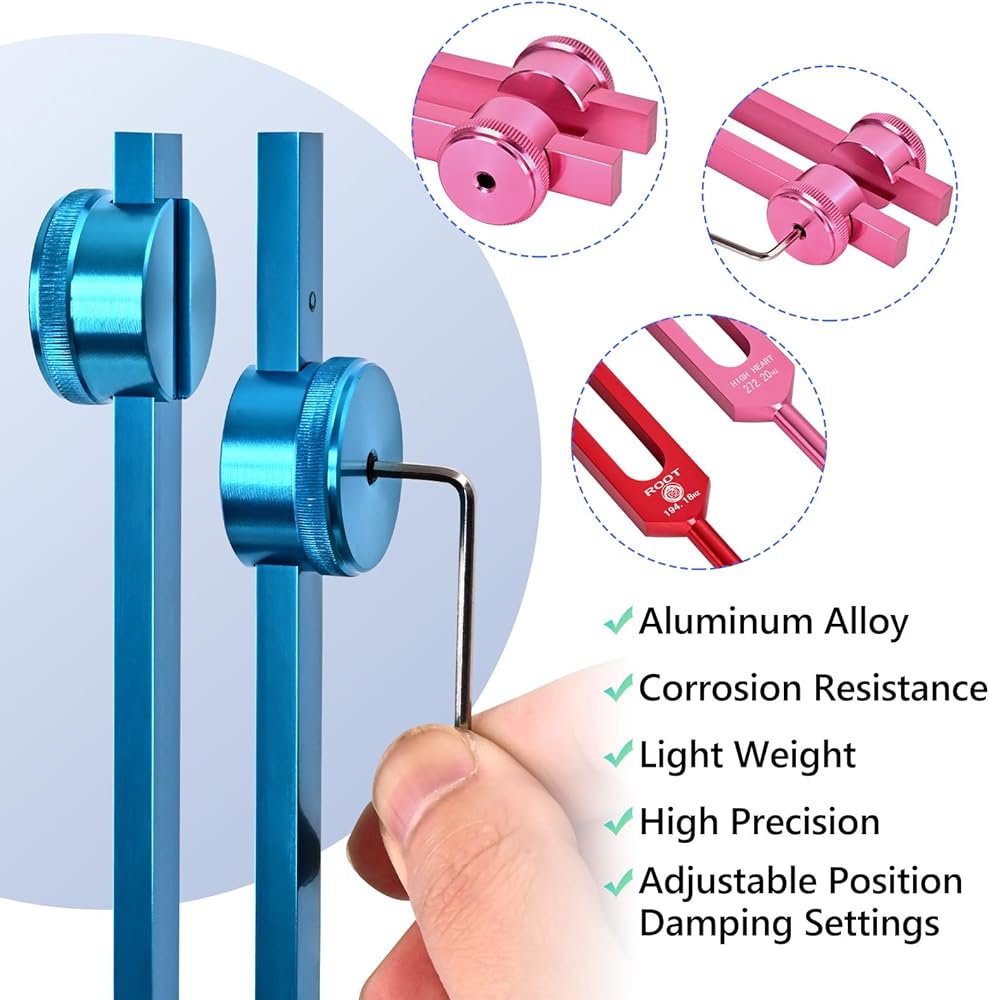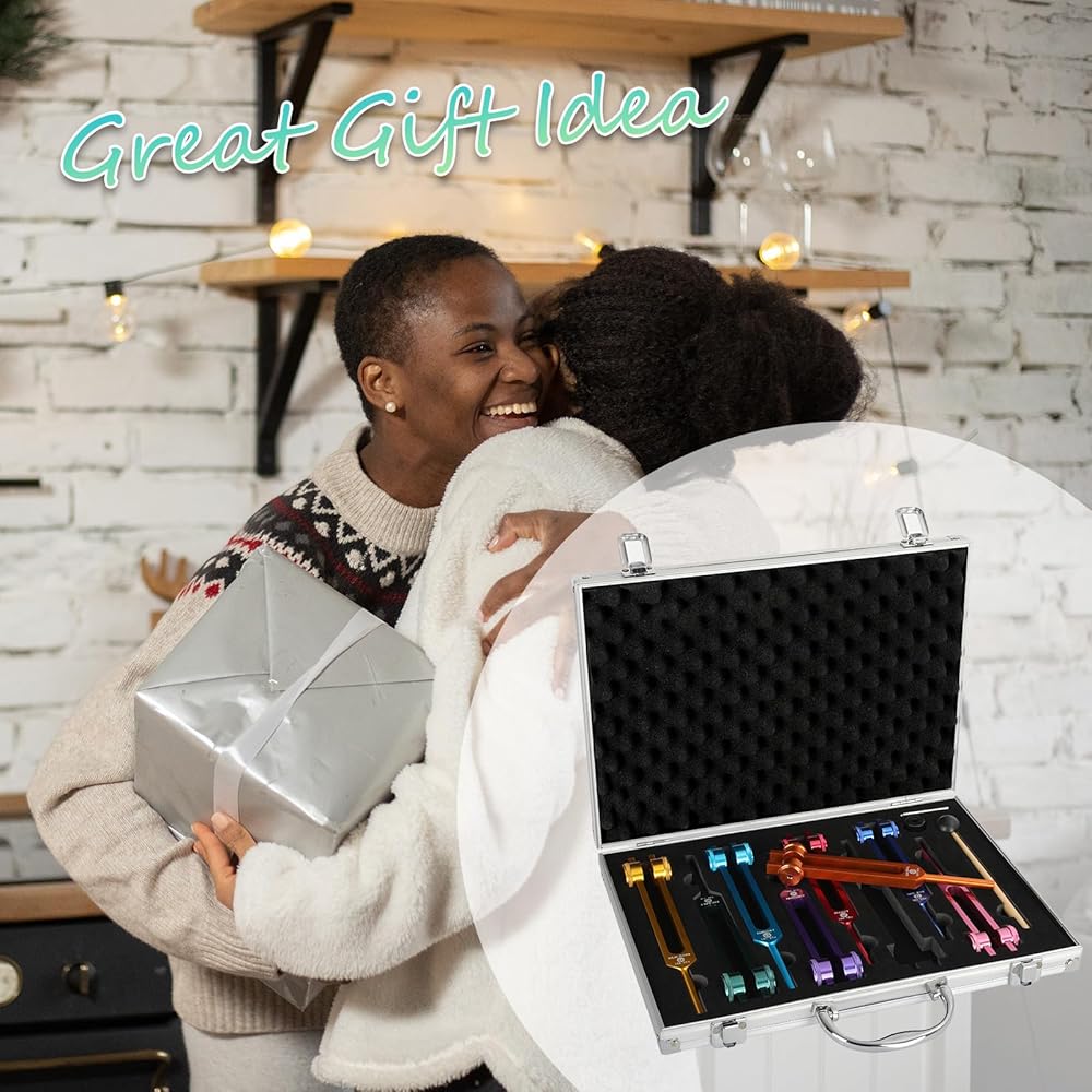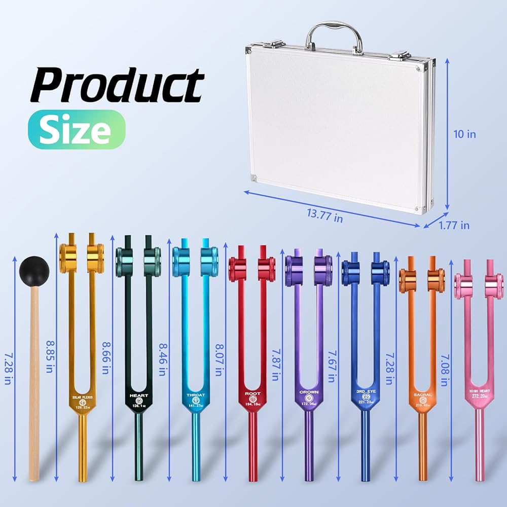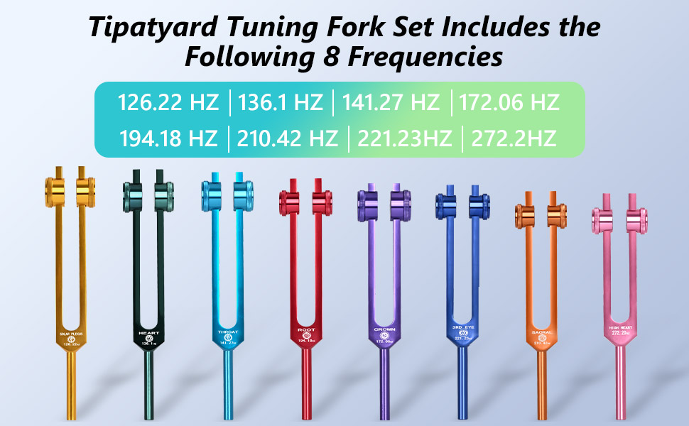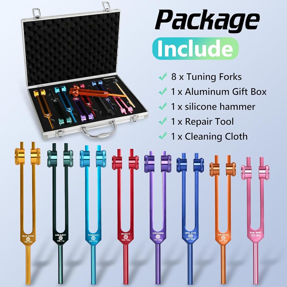 • 【Package Included】8 PCS Color Weighted Tuning Fork Set included 126.22 Hz, 136.1 Hz, 141.27 Hz, 172.06 Hz, 194.18 Hz, 210.42 Hz, 221.23Hz, 272.2Hz, 1 x silicone hammer, 1 x Aluminum Gift Box,1 x Repair Tool, 1 x Cleaning Cloth.