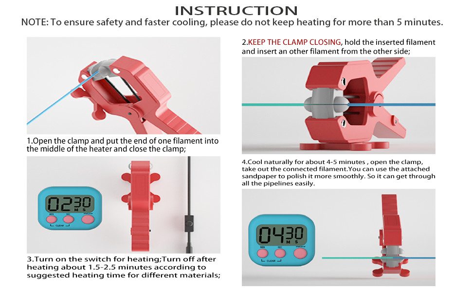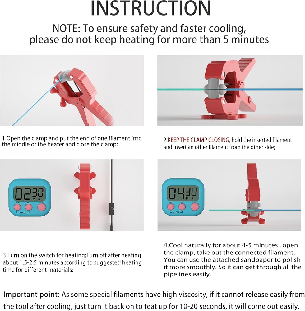 • 2. موصل خيوط الطباعة ثلاثية الأبعاد الخاص بنا يعتمد سخان درجة حرارة ثابت صغير، درجة الحرارة القصوى لا تزيد عن 220 درجة مئوية. لضمان السلامة والتبريد بشكل أسرع، يرجى عدم الاستمرار في التسخين لأكثر من 5 دقائق.