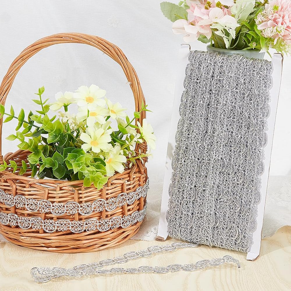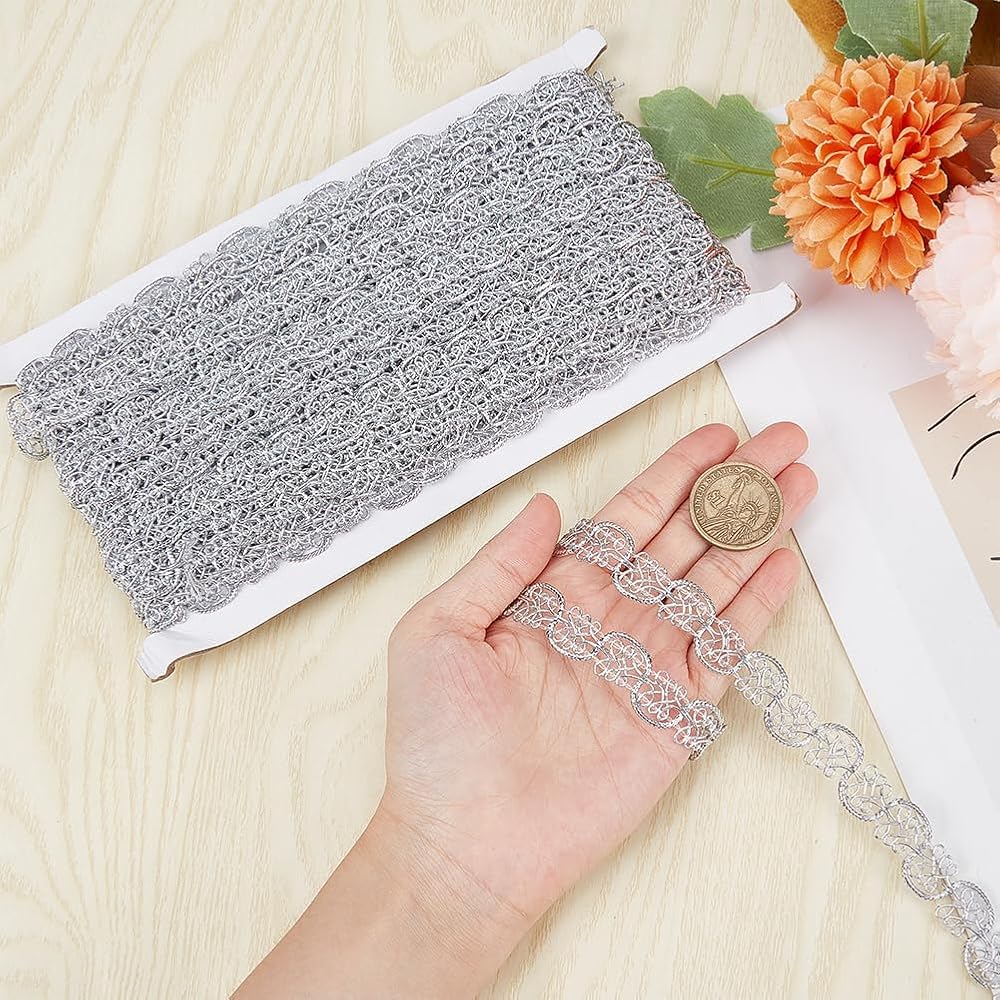 Wide Application: Silver metallic lace trim suitable for gift wrapping, baskets, curtains, tablecloths, dolls, clothes decorations and decoration for bouquets, gifts, books, bottles, wedding party decoration, bow making, scrapbooks, party, home, birthdays, valentine, Christmas and other handmade sewing craft etc.