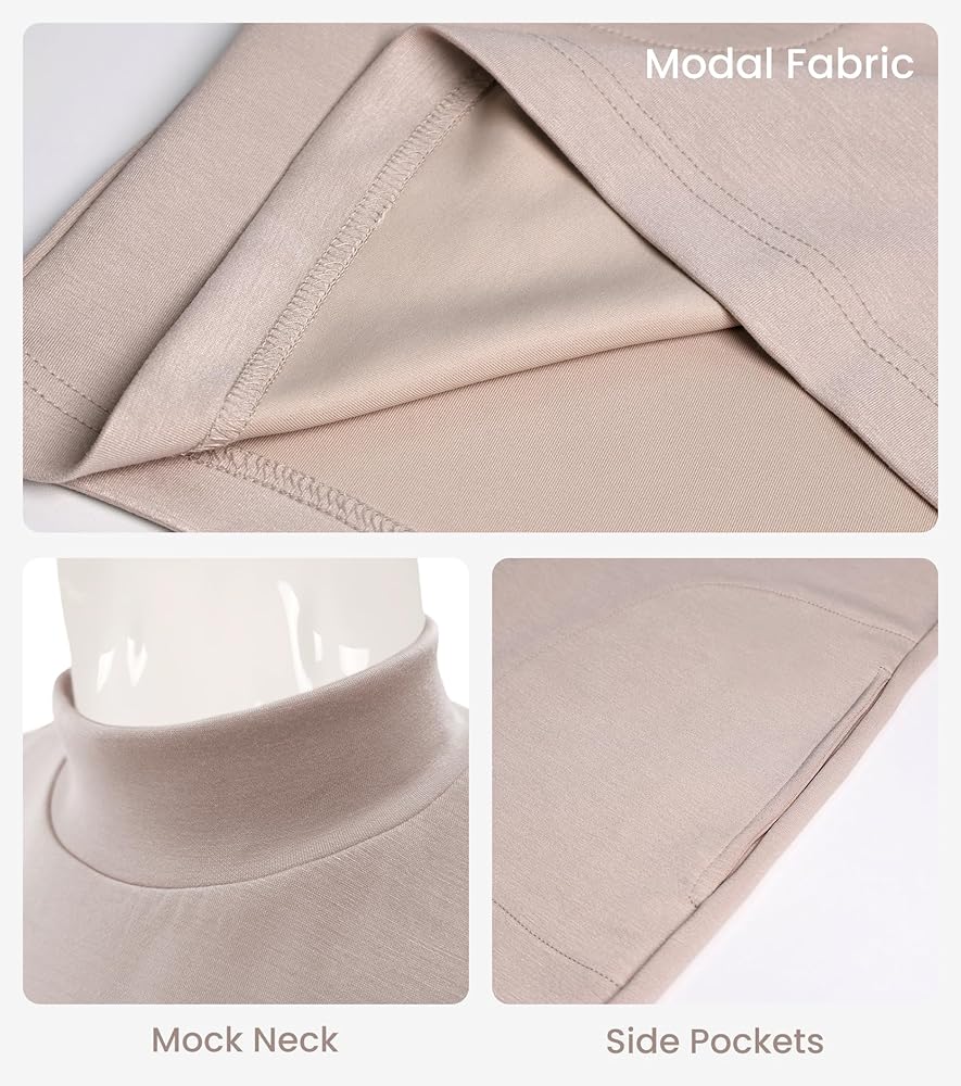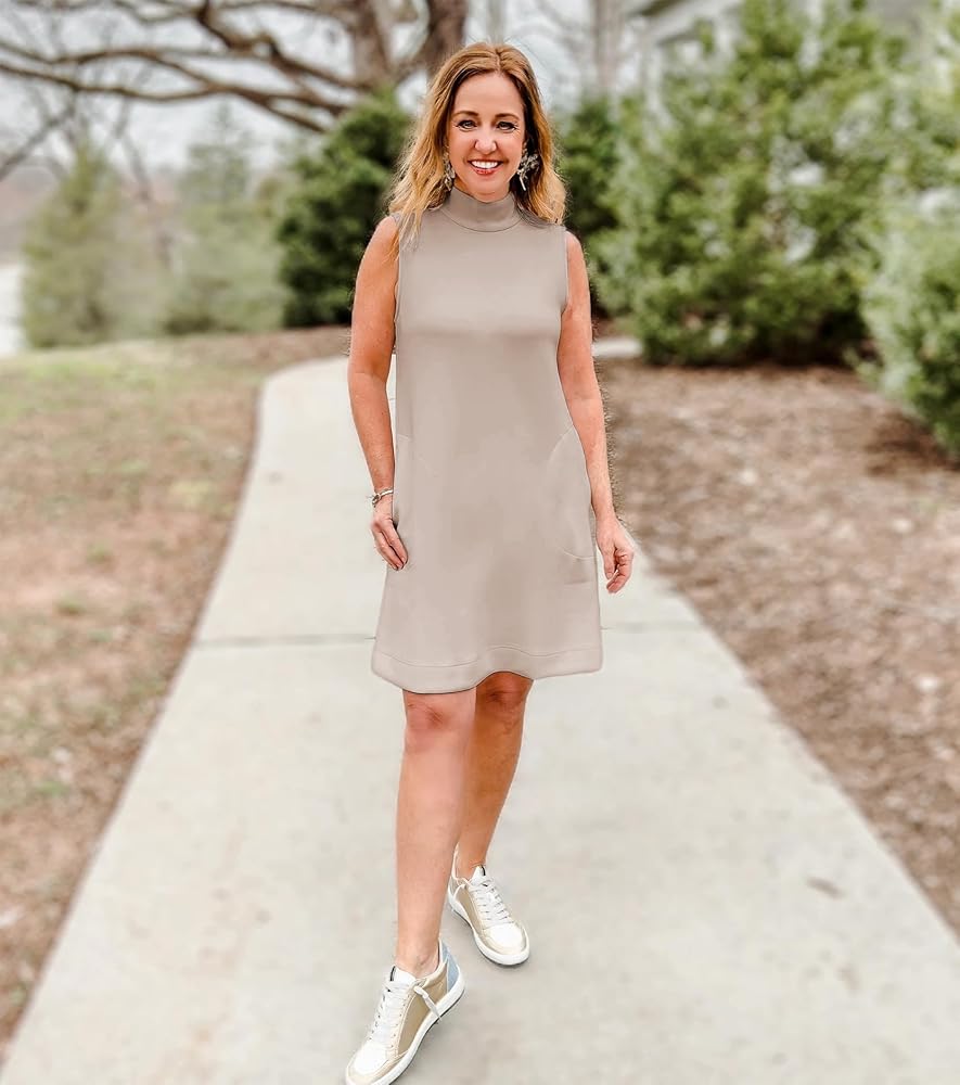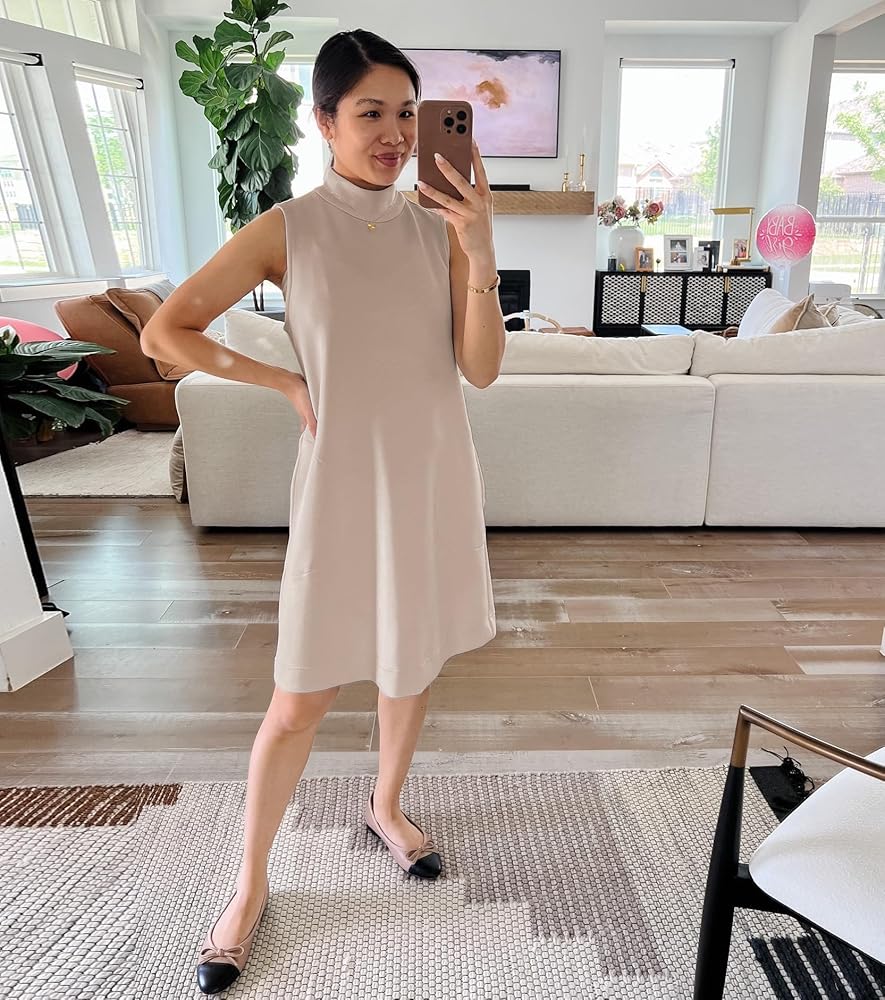 - فستان بدون أكمام برقبة وهمية مع حاشية على شكل حرف A، وجيوب جانبية عملية للهاتف الخلوي والمفاتيح والمزيد