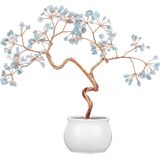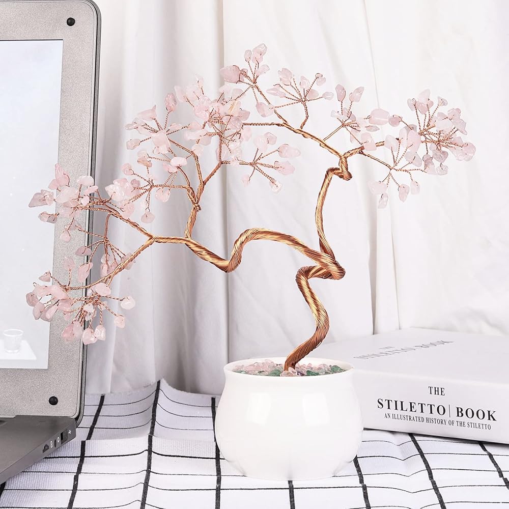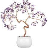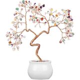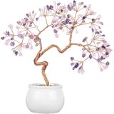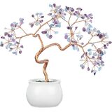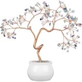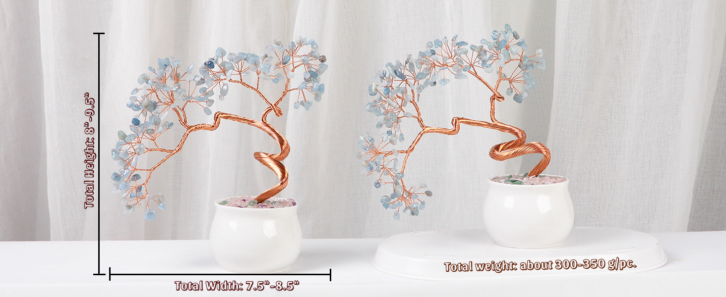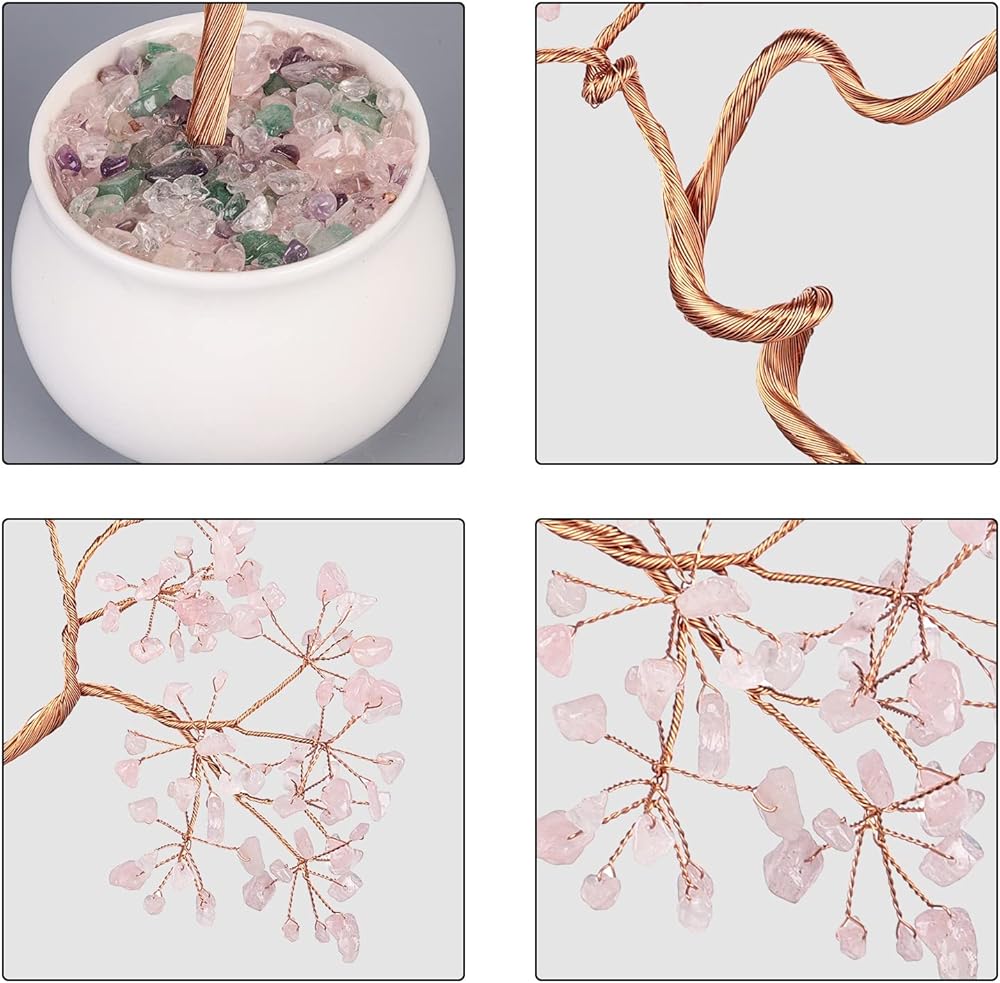 شجرة الحياة كريستال بونساي: ديكور شجرة الكريستال هذا مصنوع من الأسلاك النحاسية والبلورات المتدلية والسيراميك. تحتوي كل شريحة حجرية مصقولة على فتحة صغيرة يمكن من خلالها توصيل السلك النحاسي، ولن تسقط بسهولة. تنمو شجرة الكريستال في أصيص زهور خزفي، ويتم تغطية "الجذور" برقائق حجر الشاكرا، والتي توفر الطاقة بشكل مستمر إلى شجرة الكريستال. يرجى ملاحظة أنه نظرًا لتفرد الأحجار، فقد يختلف لونها وشكلها وملمسها قليلاً عن الصور.