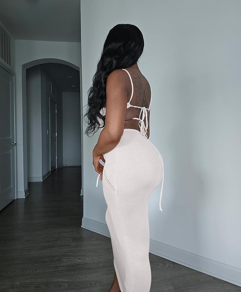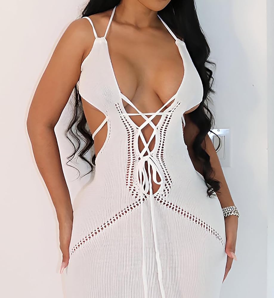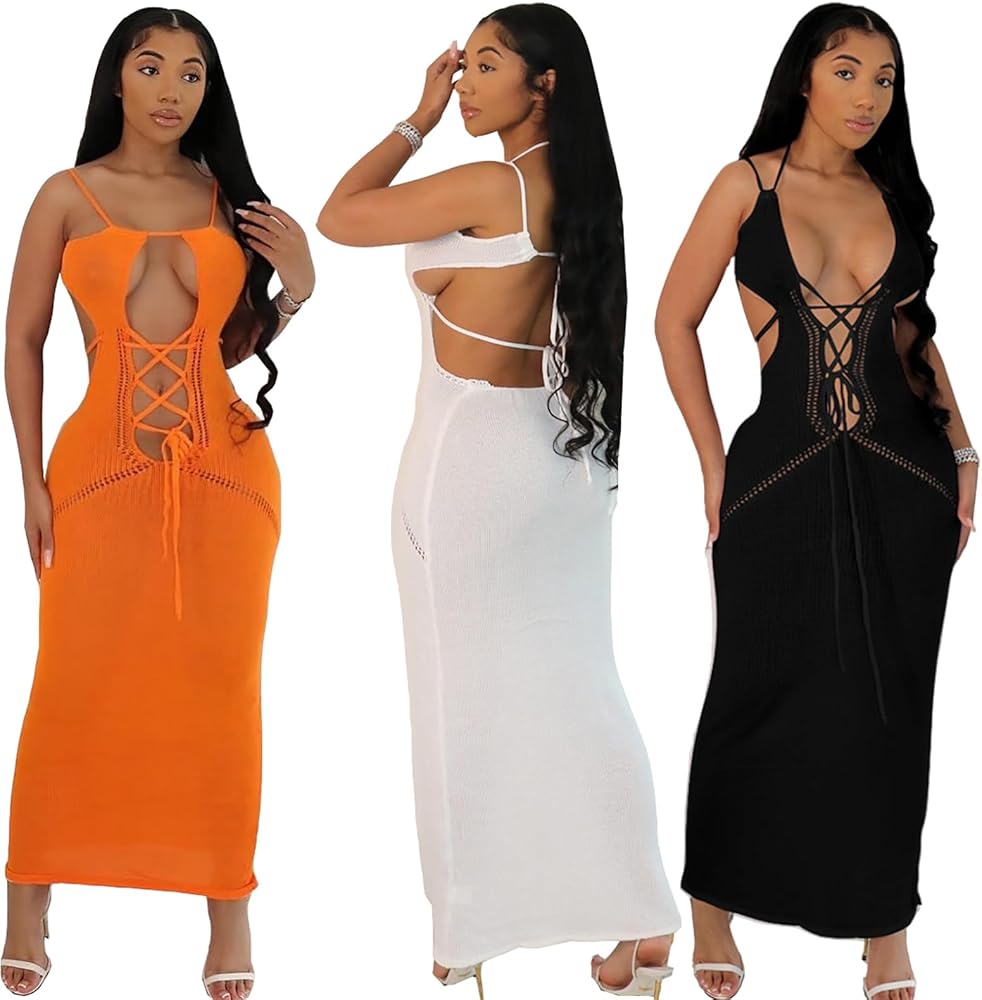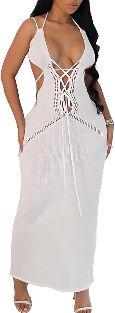المزايا: فستان طويل بأربطة للنساء، فستان طويل محبوك مجوف للنساء، بدون أكمام، بدون ظهر، رقبة رسن، رقبة عميقة على شكل حرف V، مجوف للخارج، حزام سباغيتي، لون ثابت، مقاس نحيف، فستان طويل، أربطة، مقصوص، إغلاق برباط ، سهل الارتداء والخلع