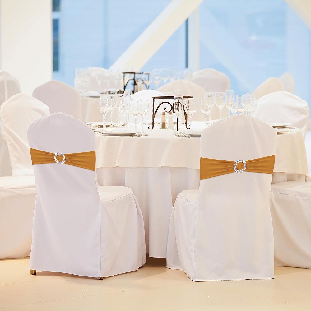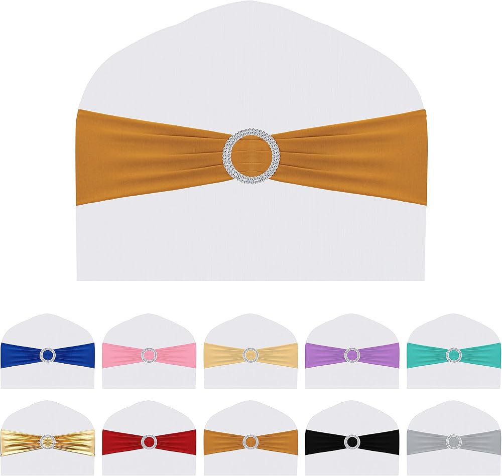 Made from spandex and polyester, these stretch chair bands are anti-wrinkle and feature hemmed stitching. The buckle is made of high quality plastic.