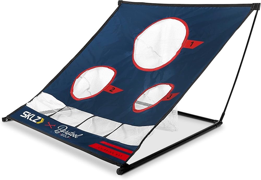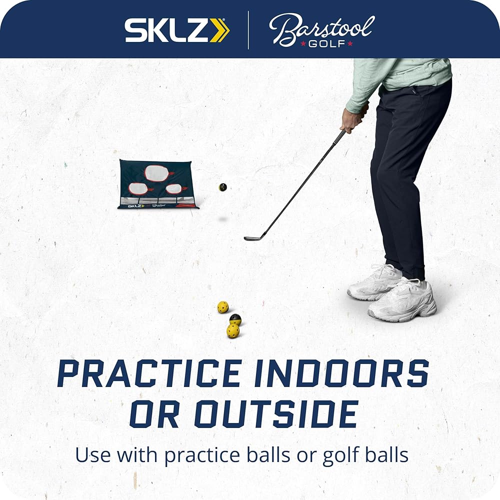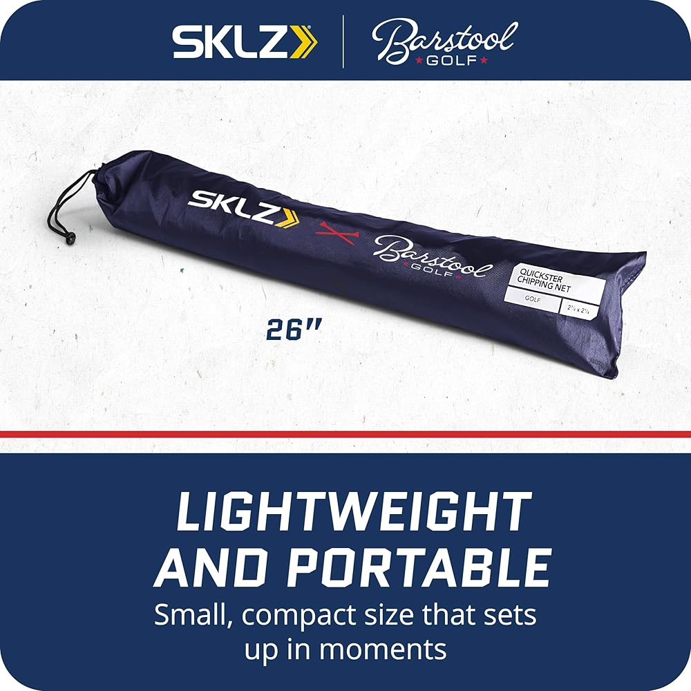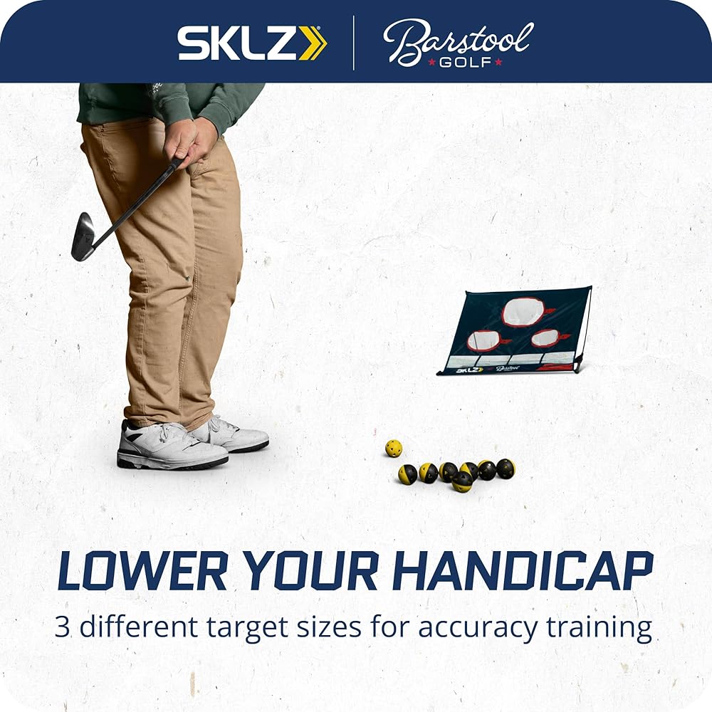 The SKLZ | Barstool Golf Chipping Net is a pinnacle of home golf training. Designed to combat inconsistent chipping and elevate short game precision, its three varied targets allow for focused accuracy training. This strategic practice can significantly reduce your stroke count, resulting in a lower handicap. The patented Tension-Tite technology ensures durability and a hassle-free setup, accommodating even the most demanding practice regimes. With the addition of a ball collection slots, efficiency is maximized by allowing continuous play and minimizing downtime, perfect for golfers with limited practice time. This feature also makes the net ideal for those with restricted space, enabling a full practice session in the comfort of your backyard or any small area. The robust net material is built to endure the impact of real golf balls, catering to all skill levels. Its portability is a bonus, making it simple to store and transport, ensuring your practice routine is never compromised. Partnered with Barstool Golf, this chipping net doesn't just offer a practical training tool; it brings an engaging, game-like element to training, fostering an enjoyable environment that encourages regular practice, ensuring consistent improvement in your game.