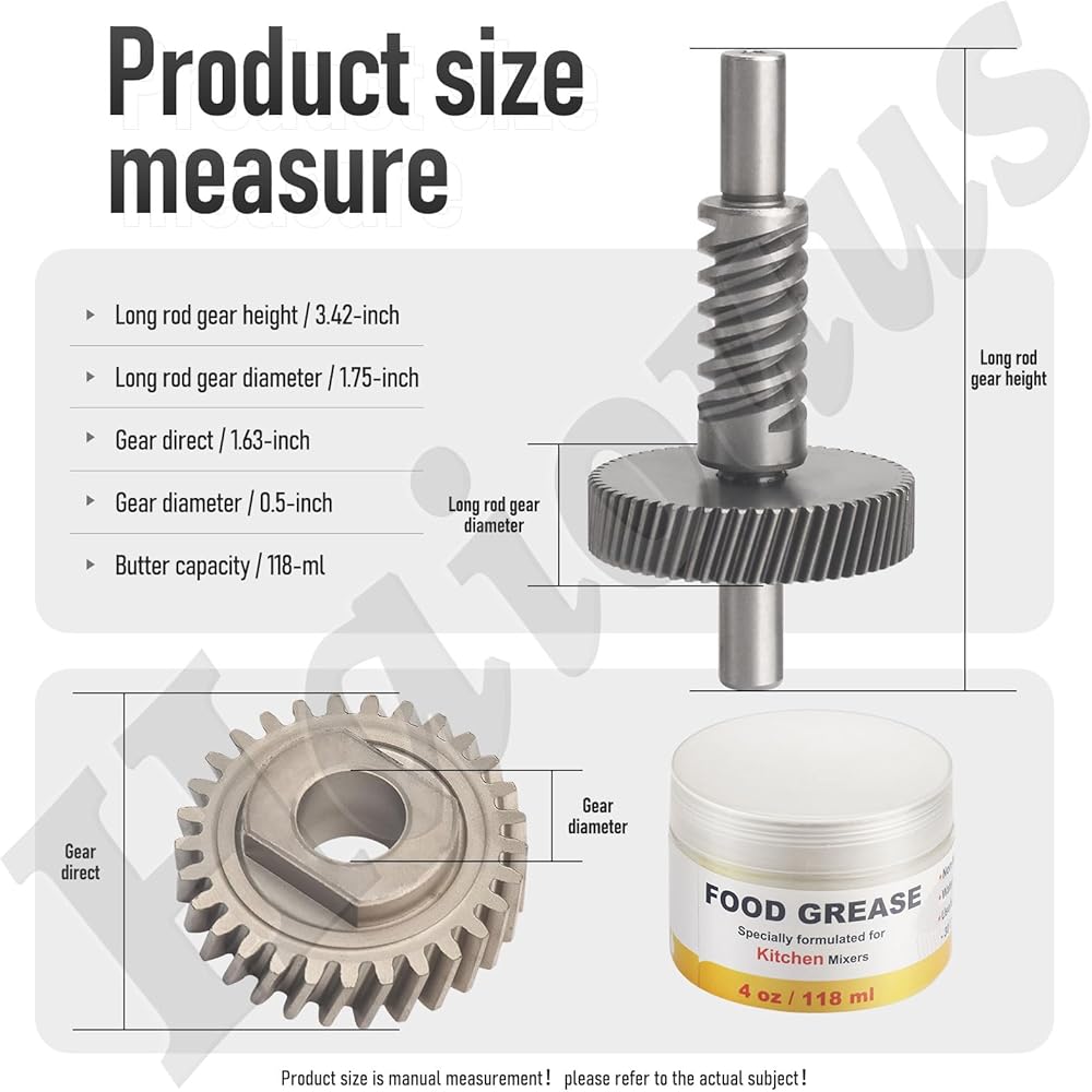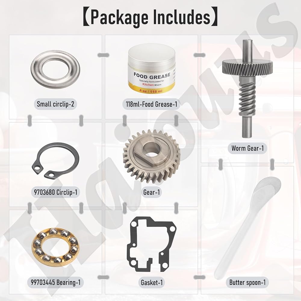 ★【Gasket Replaces part numbers:】Replaces part numbers: 9707425 9703381 Fits all 5.5 and 6 quart Kitchen Stand Mixer. ★【Package includes】1*Worm Gear 1*Gear 1*Gasket 1*99703445 Bearing 1* 9703680 Circlip 1*4oz Food Grade Grease. 🔺★Our Repair Kit Comes With: 4 ounces grease, enough for a complete repair.