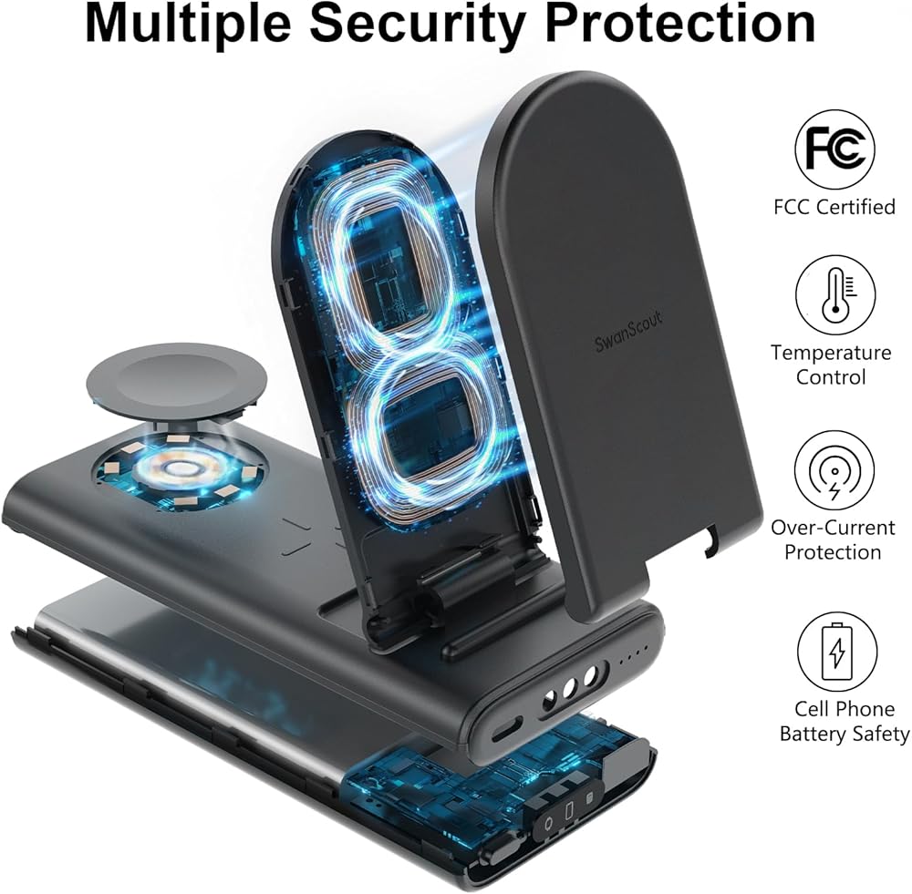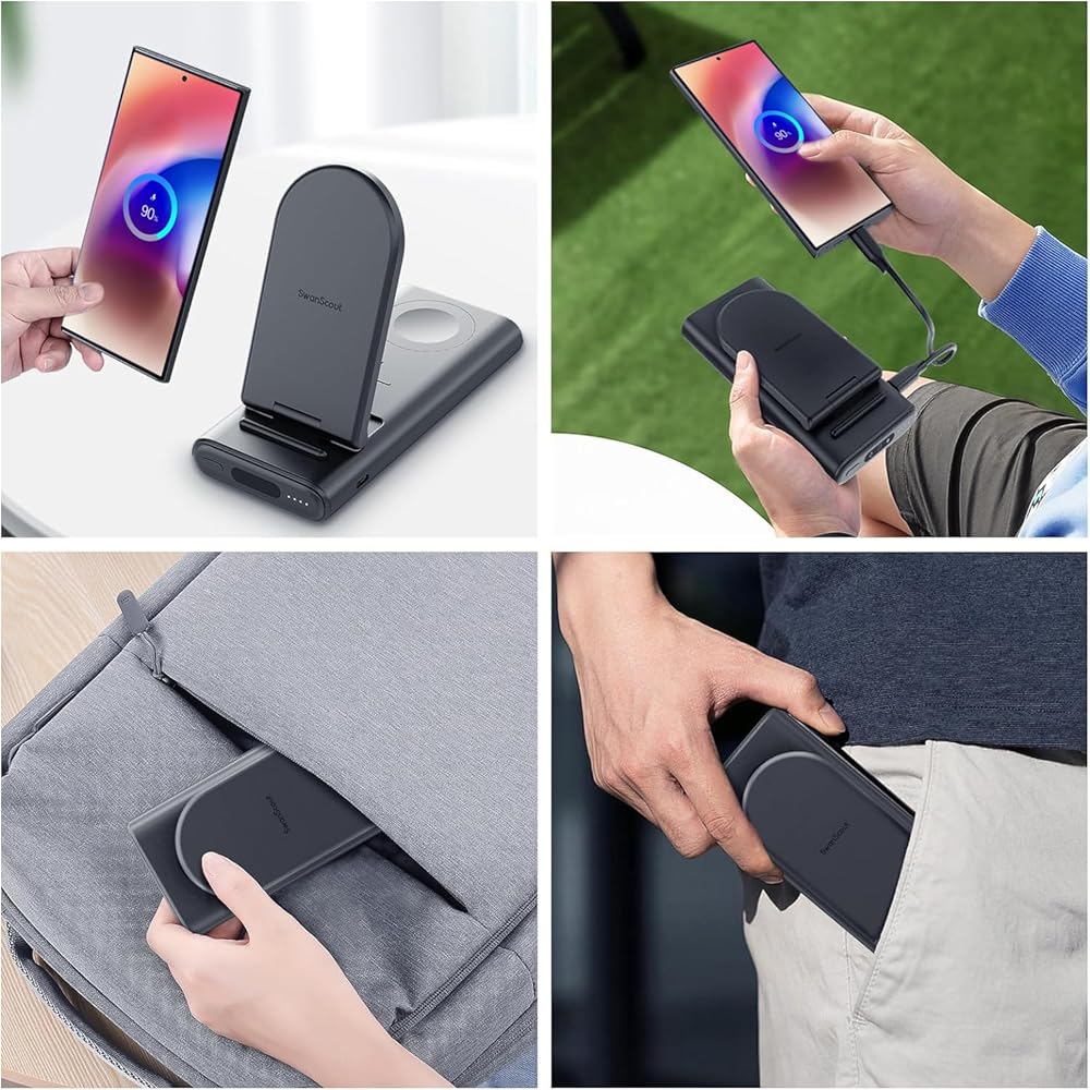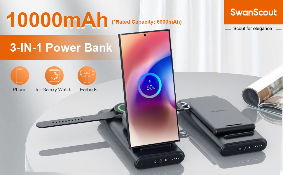بنك الطاقة 3 في 1 - يمكن لمحطة الشحن المحمولة SwanScout 10000mAh شحن الهاتف والساعة وسماعات الأذن في وقت واحد بدون مصدر طاقة. إنه أمر رائع أثناء السفر أو الأنشطة الخارجية أو المواقف التي يكون فيها الوصول إلى مصدر الطاقة محدودًا. باستخدامه، يمكنك أن تقول وداعًا لمتاعب حمل أجهزة الشحن والكابلات المتعددة.