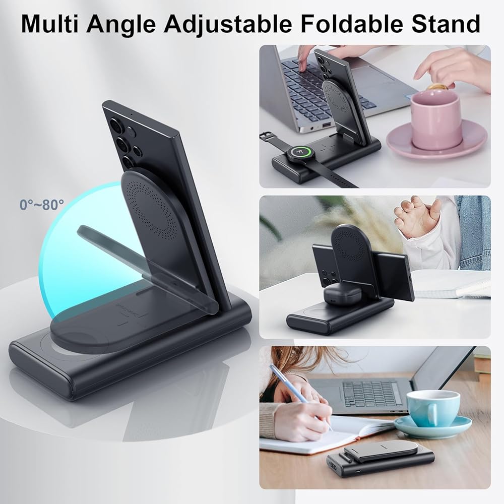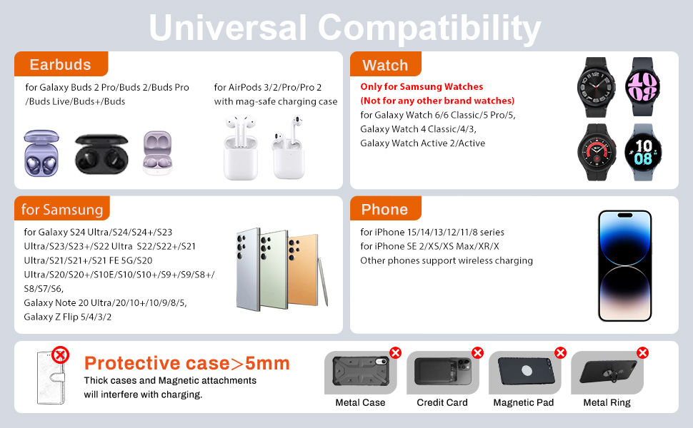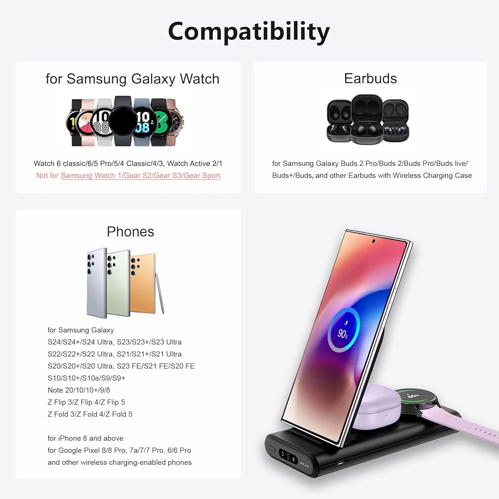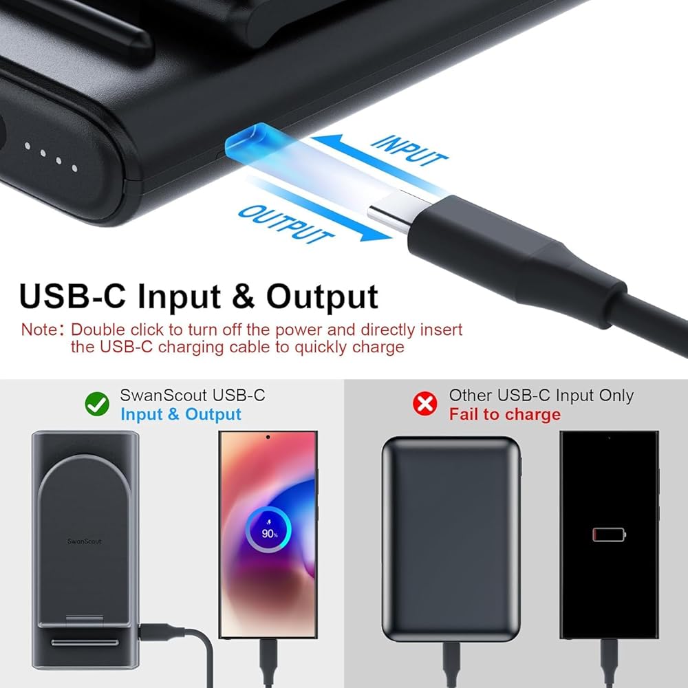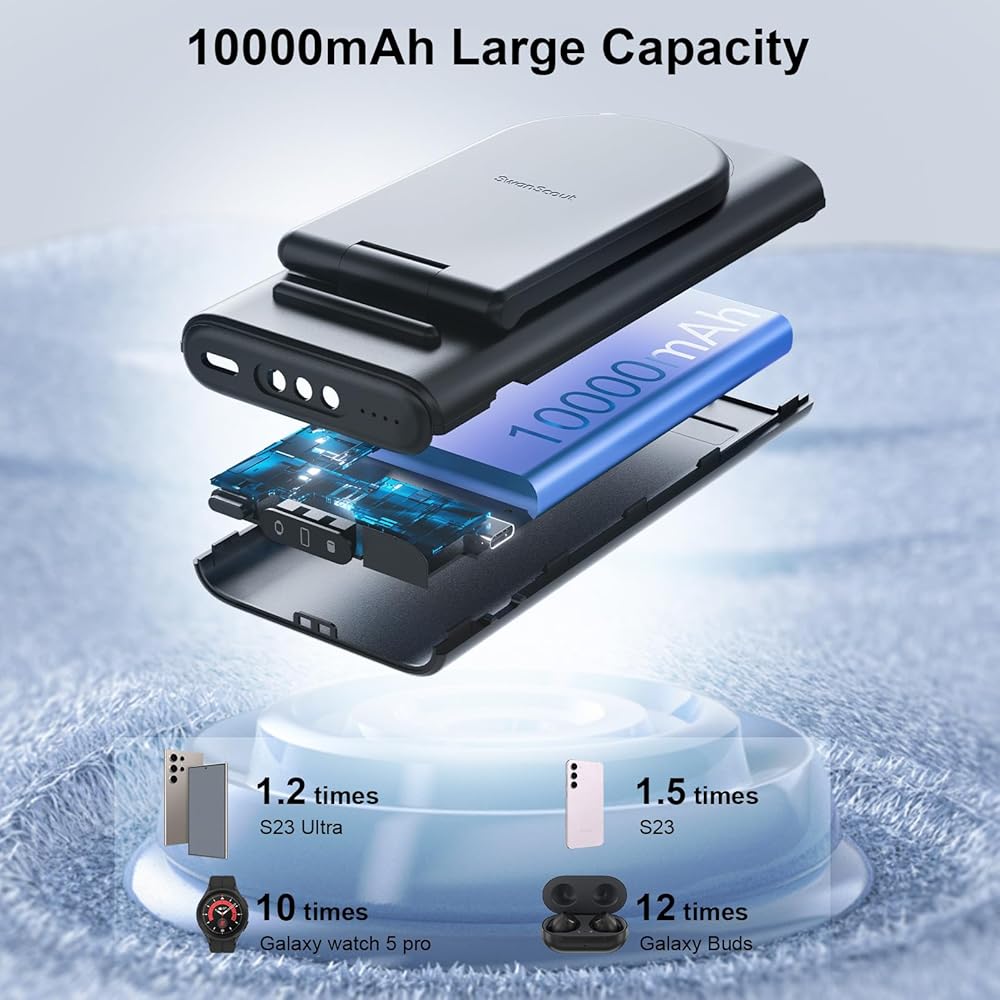 شحن لاسلكي - تم تصميم محطة الشحن المحمولة SwanScout بقدرة 10000 مللي أمبير في الساعة خصيصًا لساعة Samsung 6/6 classic/5 pro/5/4 classic/4/active 2، وليس لساعة iwatch وأي ساعات تجارية أخرى. إنه متوافق مع الهواتف وسماعات الأذن التي تدعم الشحن اللاسلكي، لهاتف Galaxy s24 Ultra/s24/s24+/s23 Ultra/s23/s23+/s22 Ultra/s22/s21/s20/note 20/z flip 5/zfold 5، لهاتف iphone 15/ سلسلة 14/13/12/11، وGalaxy Buds 2/2 pro/pro، لأجهزة Airpods pro 2/3/2 مع علبة شحن آمنة.