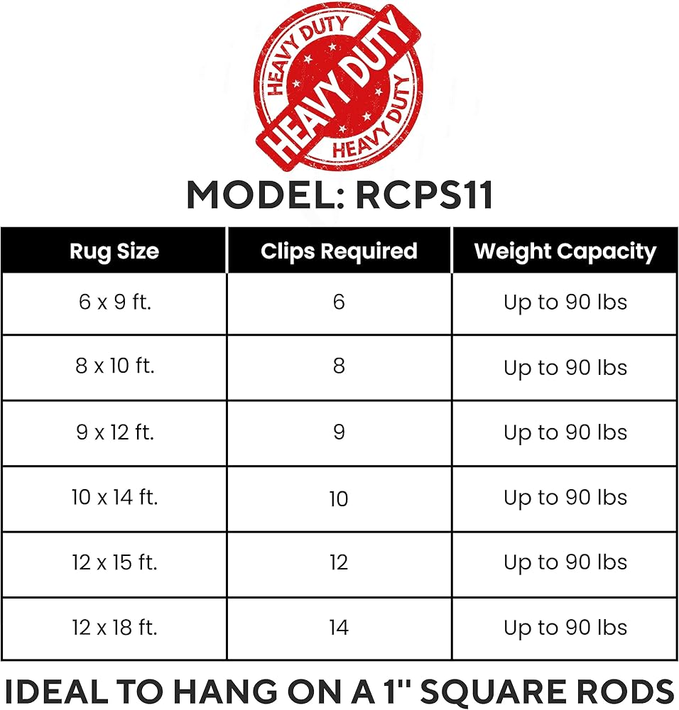 【يتم تعليق السجاد ذو المساحة الكبيرة】مثالي للتعليق على قضيب سجادة مربعة مقاس 1 بوصة أو ذراع الرف. يمكن أن تحمل ما يصل إلى 12 × 18 قدمًا من السجاد بوزن يصل إلى 90 رطلاً. حجم السجادة: 6 × 9 قدم. يتطلب 6 مشابك للحصول على قبضة مثالية. حجم السجادة: 8 × 10 قدم. يتطلب 8 مشابك للحصول على قبضة مثالية. حجم السجادة: 9 × 12 قدم. يتطلب 9 مشابك للحصول على قبضة مثالية. حجم السجادة: 10 × 14 قدم. يتطلب 10 مشابك للحصول على قبضة مثالية. حجم السجادة: 12 × 15 قدم. يتطلب 12 مشبكًا لقبضة مثالية. حجم السجادة: 12 × 18 قدم. يتطلب 14 مشبكًا لقبضة مثالية.