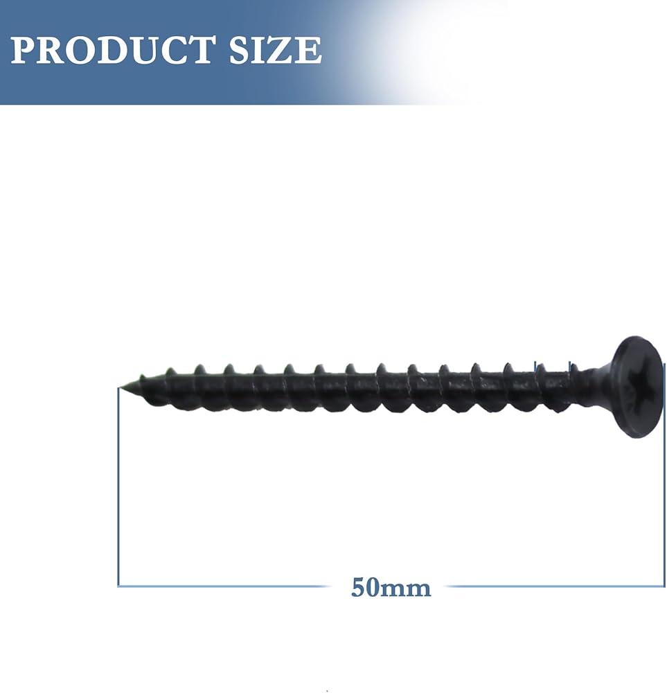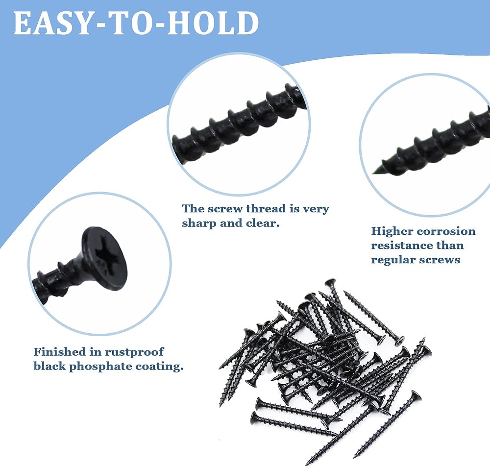Black Phosphate Coating: The screws have a black phosphate coating that provides a corrosion-resistant finish and enhances the appearance of the screws. The coating also helps to prevent rust and provides better grip in the material being screwed.