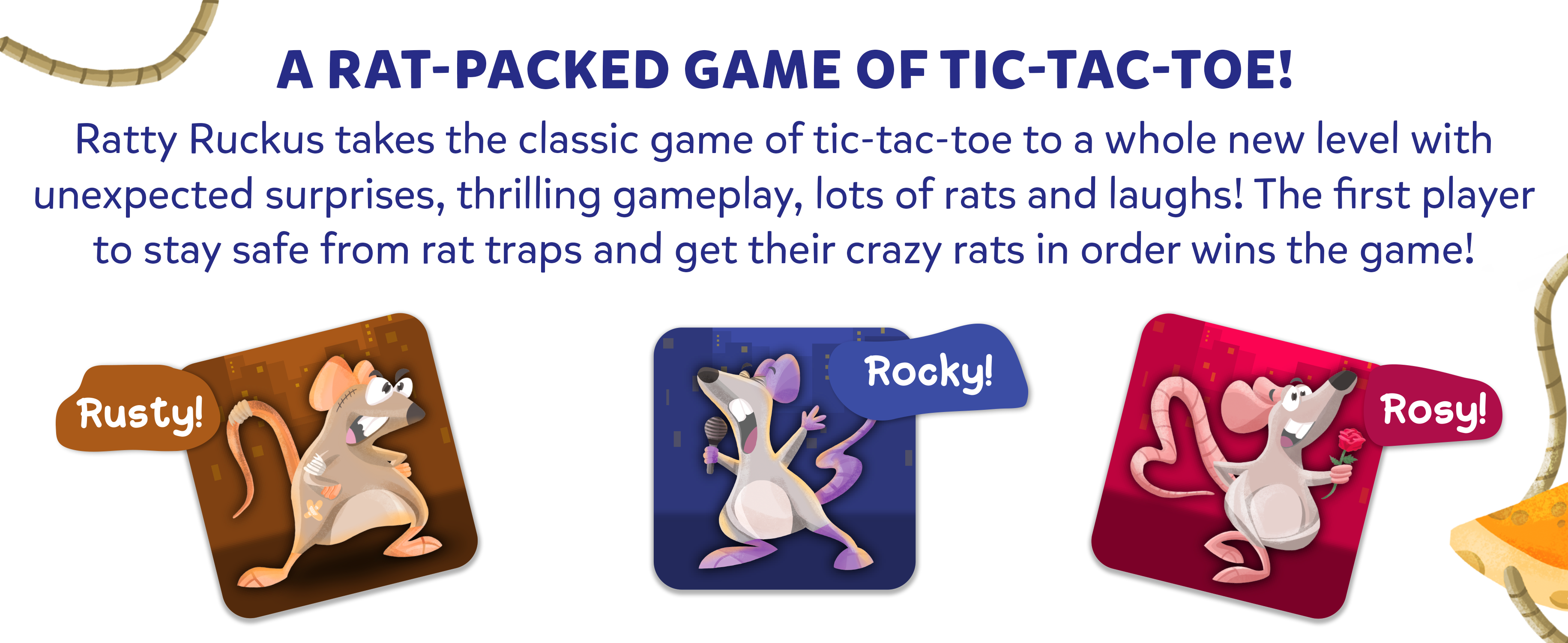 لعبة تيك تاك تو مع مفاجآت غير متوقعة!: يأخذ Ratty Ruckus لعبة تيك تاك تو الكلاسيكية إلى مستوى جديد تمامًا مع مفاجآت غير متوقعة، وطريقة لعب مثيرة، والكثير من الفئران والضحك! يجب على اللاعبين إنشاء سلسلة من الفئران المطابقة في شبكة 4 × 4 إما أفقيًا أو رأسيًا أو قطريًا. أول لاعب يصطف الفئران يأخذ الجبن!
