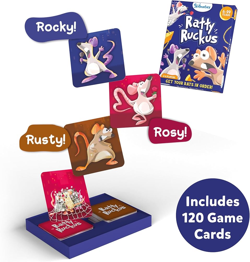 لعبة سهلة وسريعة وممتعة للعائلات: Ratty Ruckus هي لعبة بطاقات سهلة التعلم وسريعة الوتيرة ومليئة بالمرح، وهي مثالية للعب العائلي ليلاً أو للترفيه أثناء التنقل. إنها لعبة جذابة تشجع اللاعبين على تطوير مهارات حل المشكلات والاستراتيجية وصنع القرار، مما يجعلها خيارًا ممتازًا لوقت الترابط العائلي.