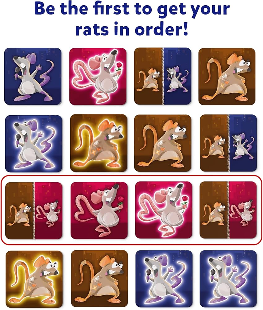 كيفية اللعب بطريقة الجرذ!: يجب على اللاعبين/الفرق إنشاء سلسلة من أربعة فئران متطابقة إما قطريًا أو رأسيًا أو أفقيًا عبر الشبكة 4 × 4. كل تسلسل ناجح يكسب نقطة وينهي الجولة، أول لاعب أو فريق يصل إلى ثلاث نقاط يفوز باللعبة!
