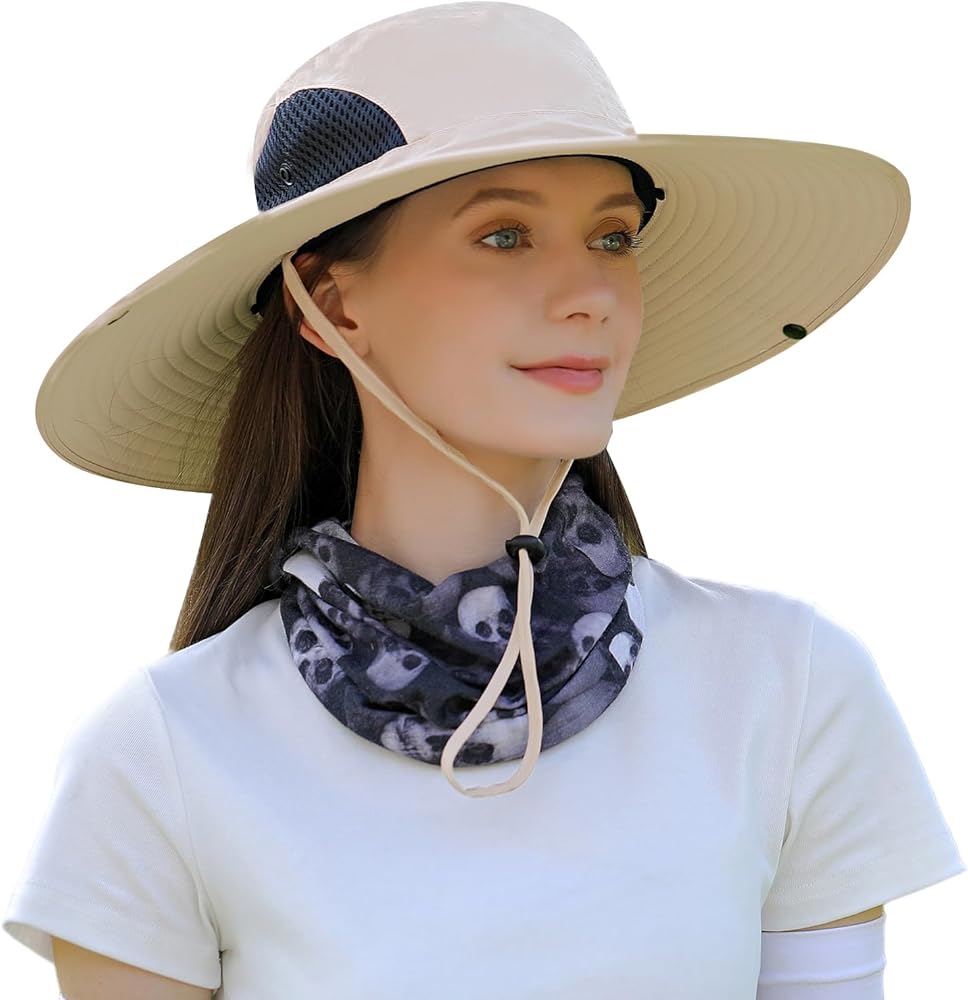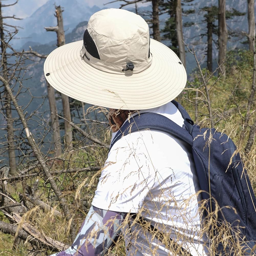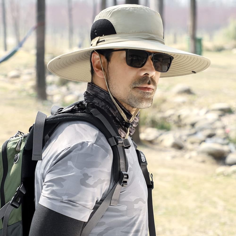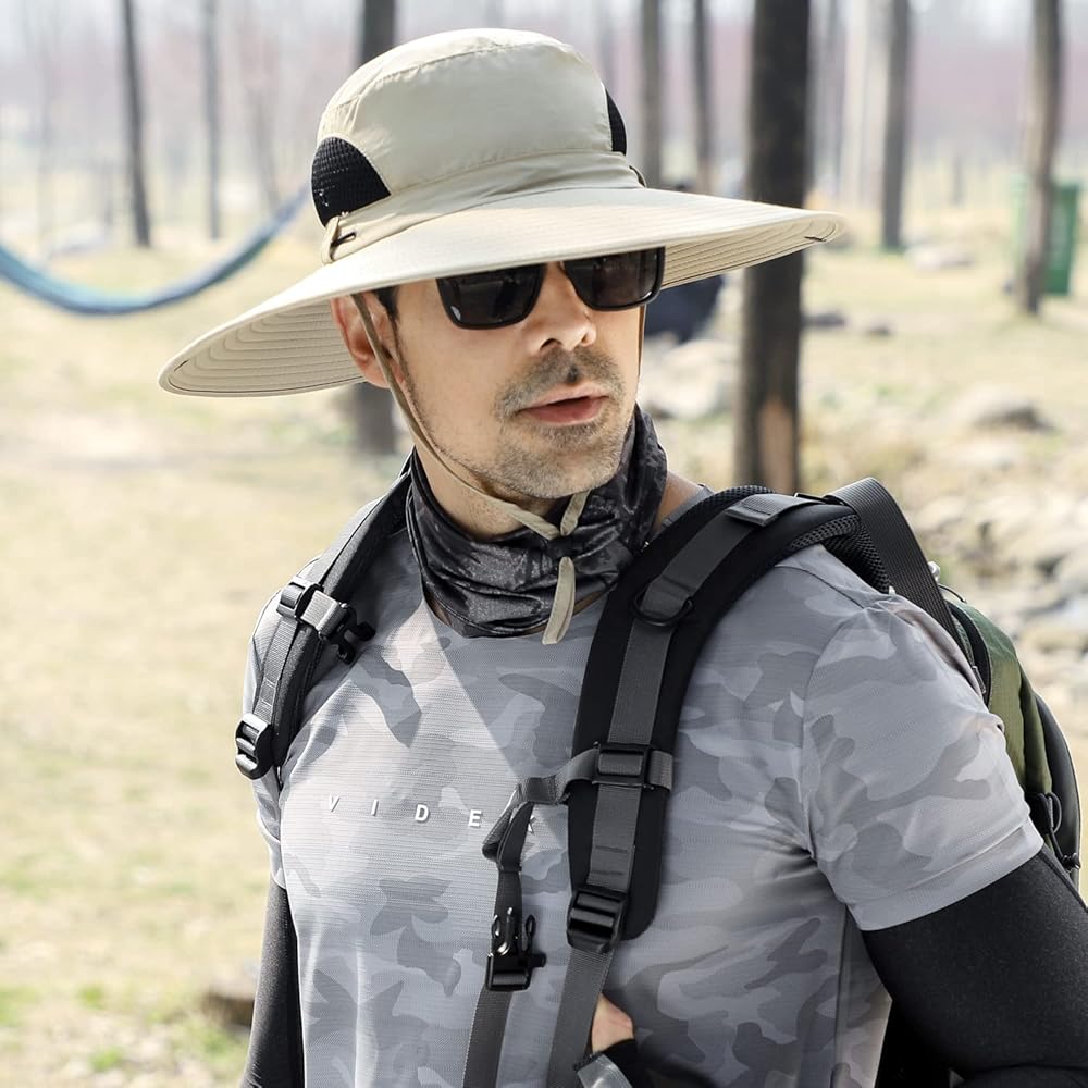 مقاس قابل للتعديل: مقاس واحد يناسب محيط رأس الرجال والنساء من 22 إلى 24 بوصة، حافة عريضة 4.7 بوصة / 12 سم، يحافظ على الوجه والرقبة من الأشعة الضارة، تصميم برباط مرن خلفي، حزام ذقن قابل للتعديل يثبت القبعة في مكانها في الأيام العاصفة.