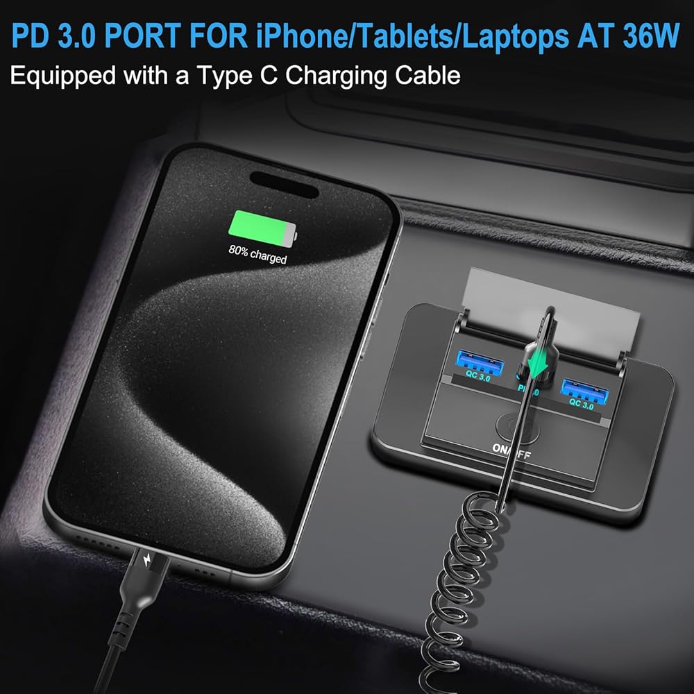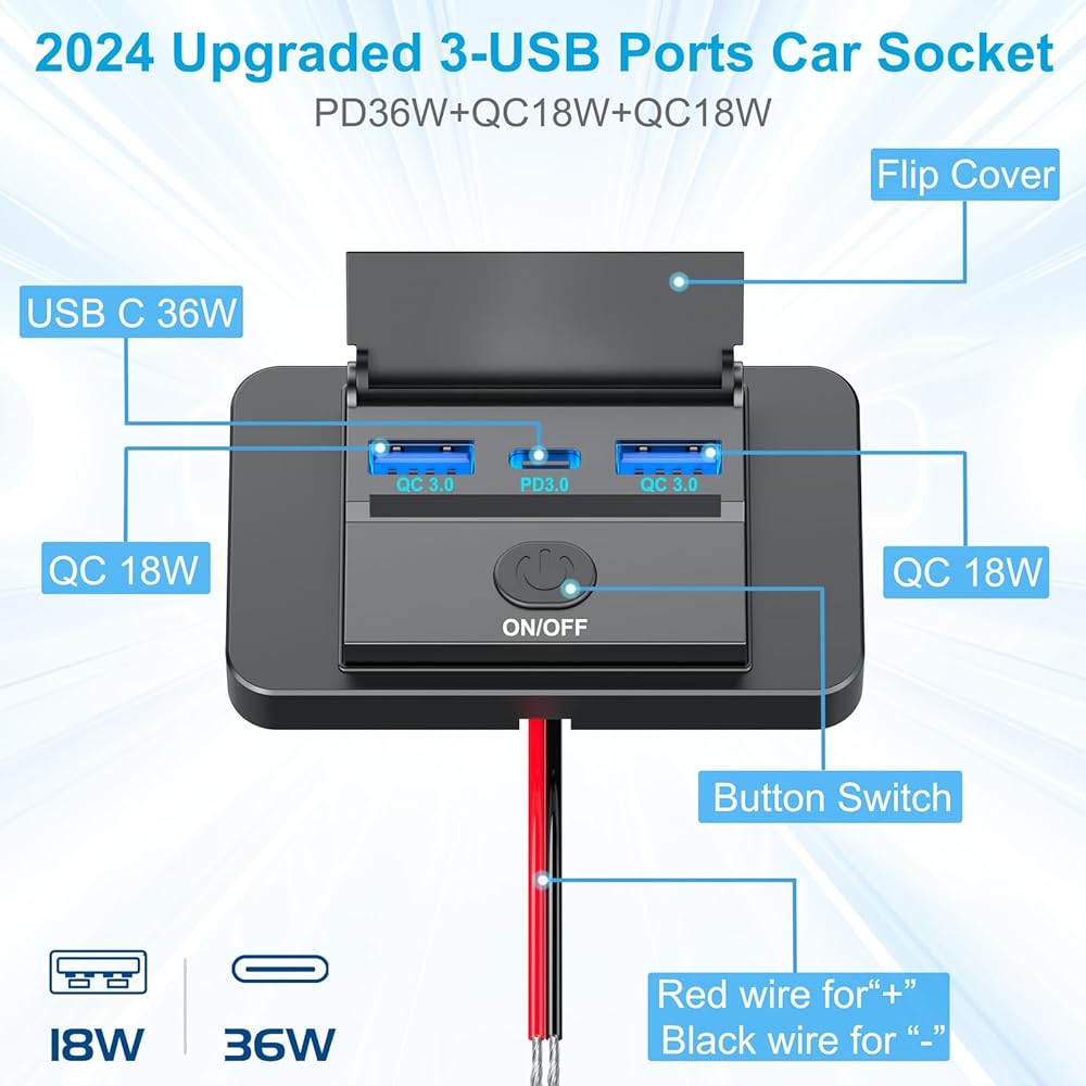 • 【شحن سريع متزامن بثلاثة منافذ】تم تجهيز منفذ USB المطور بقدرة 12 فولت بمنفذ USB-C PD 3.0 ومنفذين USB-A. يوفر منفذ PD أقصى خرج يبلغ 36 وات، بينما يوفر منفذ مراقبة الجودة ما يصل إلى 18 وات. يسمح بشحن ثلاثة أجهزة في وقت واحد دون أي تدخل.