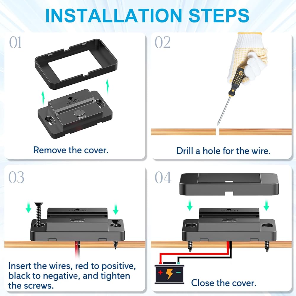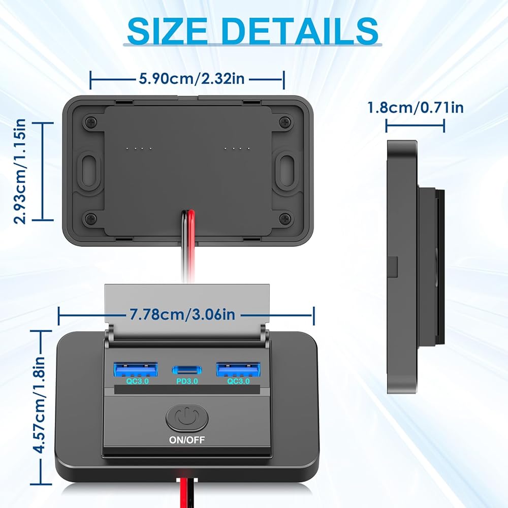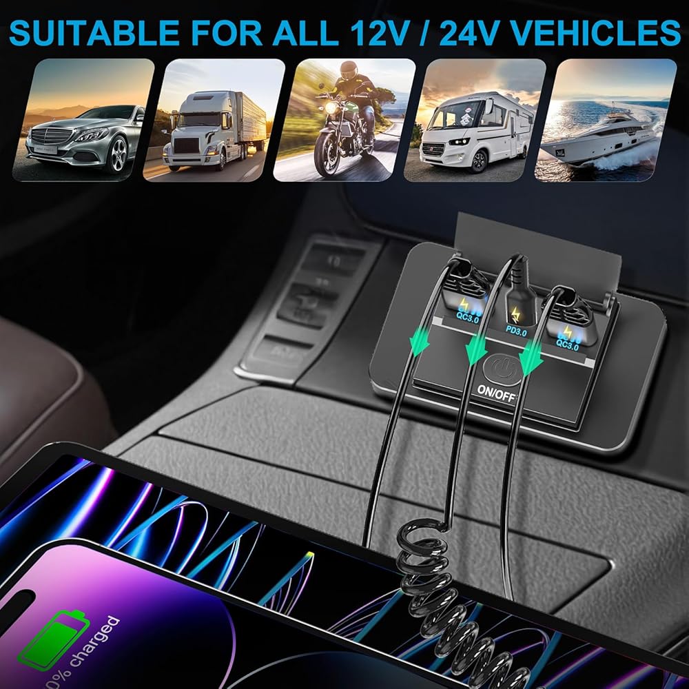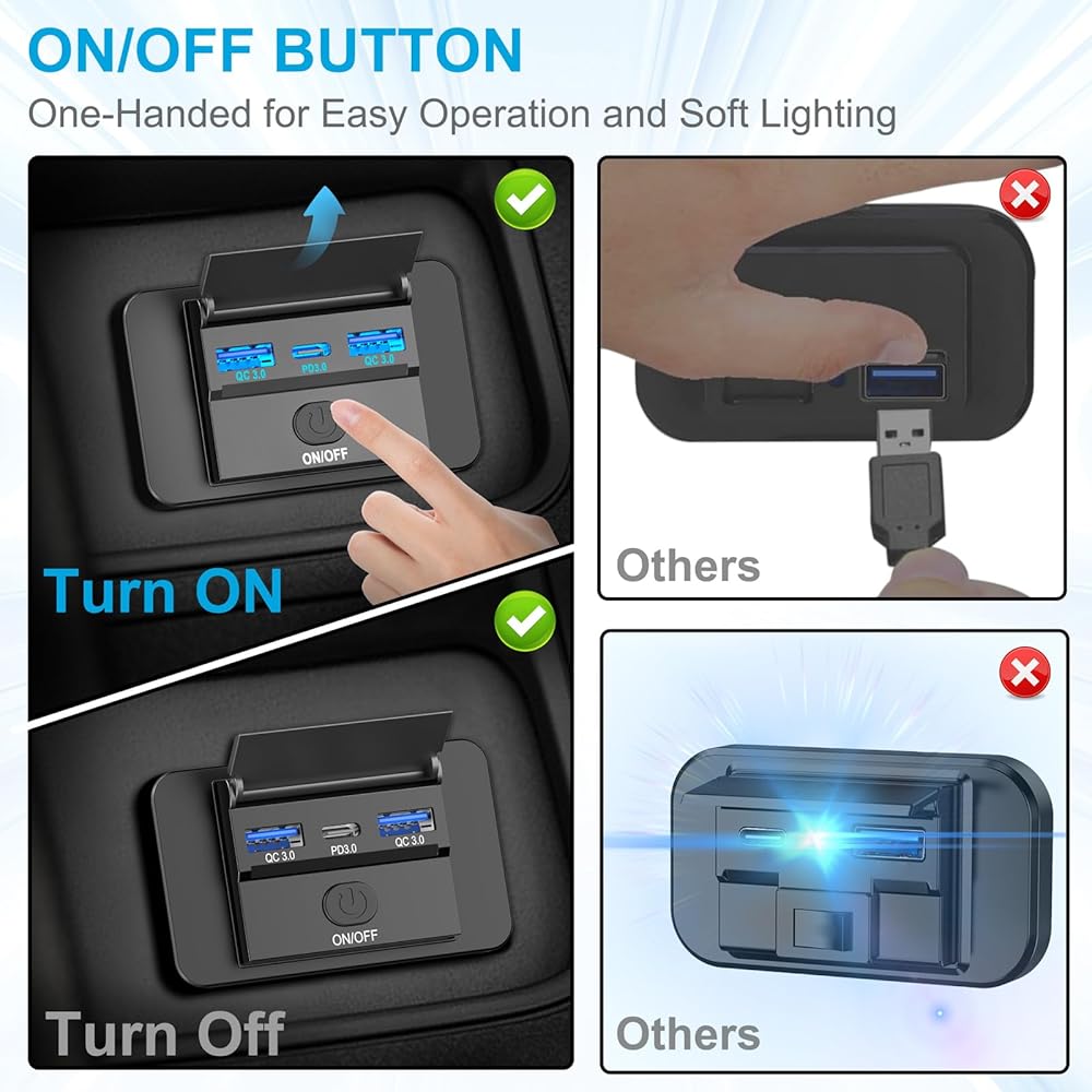 • [مفتاح طاقة مضاد للانزلاق] يتميز مقبس USB المحسن بقدرة 12 فولت بمفتاح تشغيل/إيقاف تشغيل مضاد للانزلاق، مما يمنع تصريف البطارية من إضاءة LED الثابتة ويطيل عمر البطارية. يتم إيقاف تشغيل المفتاح افتراضيًا، وعندما لا يكون قيد الاستخدام، يمكن إيقاف تشغيله للحفاظ على الطاقة.