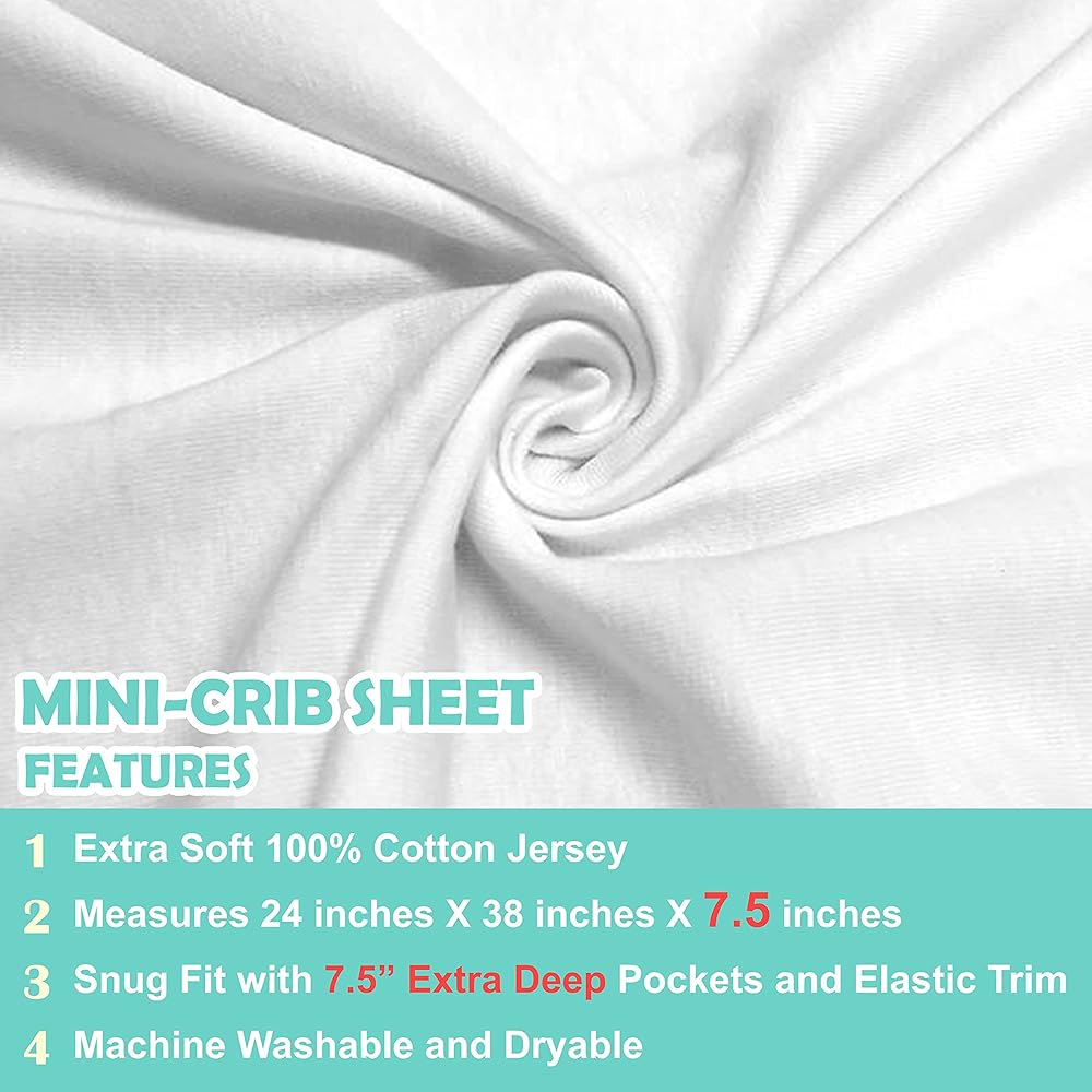 Our 100% Cotton value jersey knit fitted mini crib sheet provides comfort for the next generation. Fits extra thick 24" x 38" mini crib mattresses and can fit up to 5" thick mattresses. Fits the Dream on Me Porta Crib Mattress; Deep pockets with elastic all around provide a snug and secure fit for baby's comfort. Machine washable cold with gentle cycle, tumble dry low for best results.