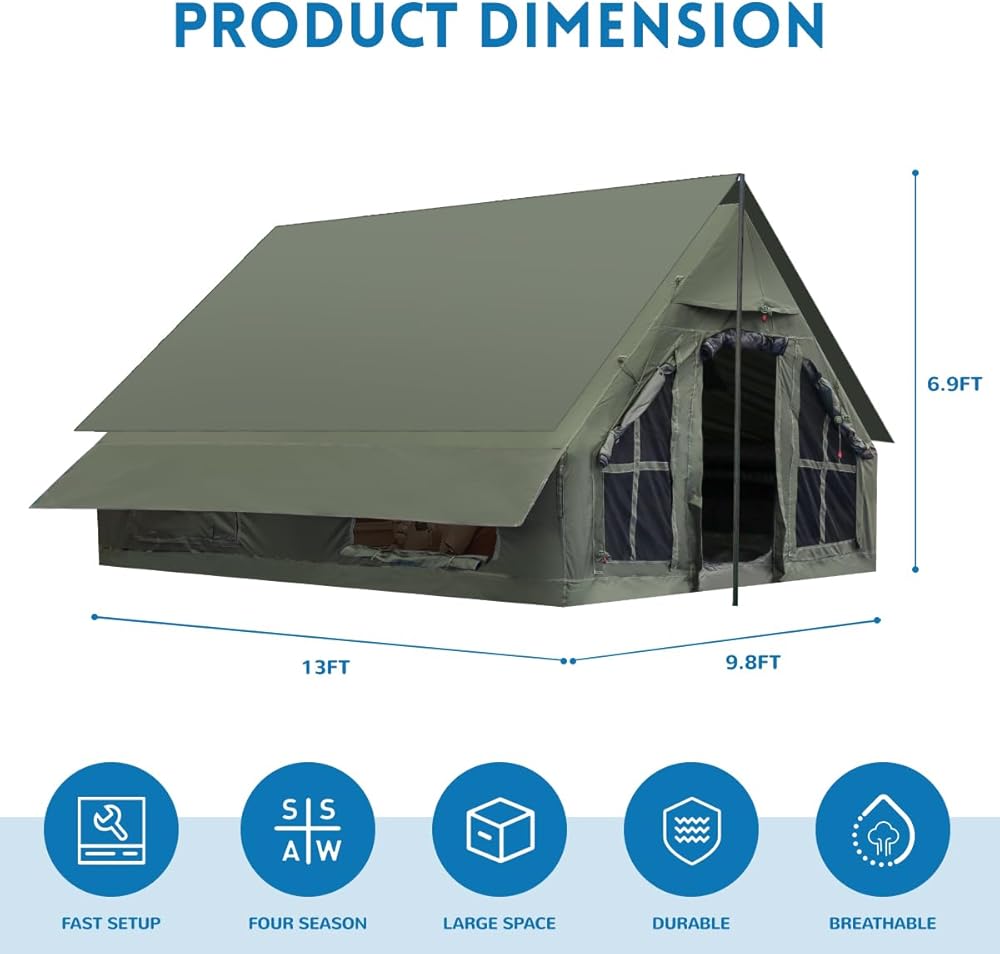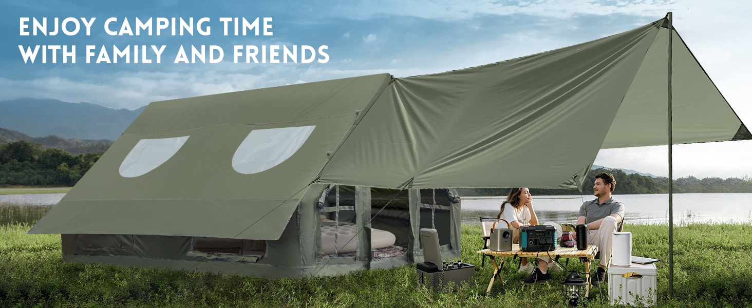 مساحة كبيرة: الحجم: 13 × 9.8 × 7 قدم، يمكن لخيمة التخييم القابلة للنفخ أن تستوعب ما يصل إلى 8-10 أشخاص مع مساحة كافية للوقوف والتجول في الداخل، مما يوفر مساحة واسعة ومريحة لك ولعائلتك وأصدقائك. لن تكون ساحقة. كما نقوم بتوفير حقيبة تخزين لسهولة الحمل. إنها الخيار الأمثل للأنشطة الخارجية مثل التخييم والنزهات وحفلات الشواء والسفر والاسترخاء على الشاطئ، لذلك يمكنك أنت وأصدقاؤك أو عائلتك الاستمتاع بالهواء الطلق معًا!