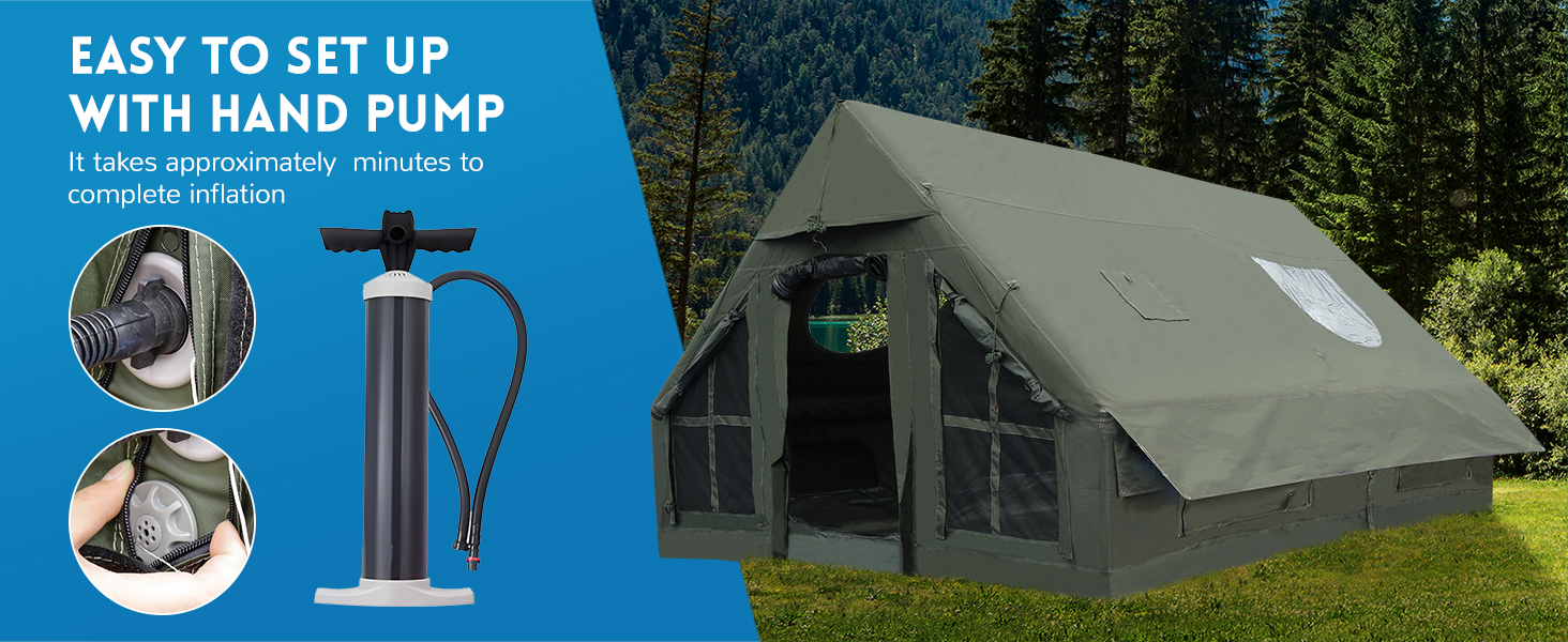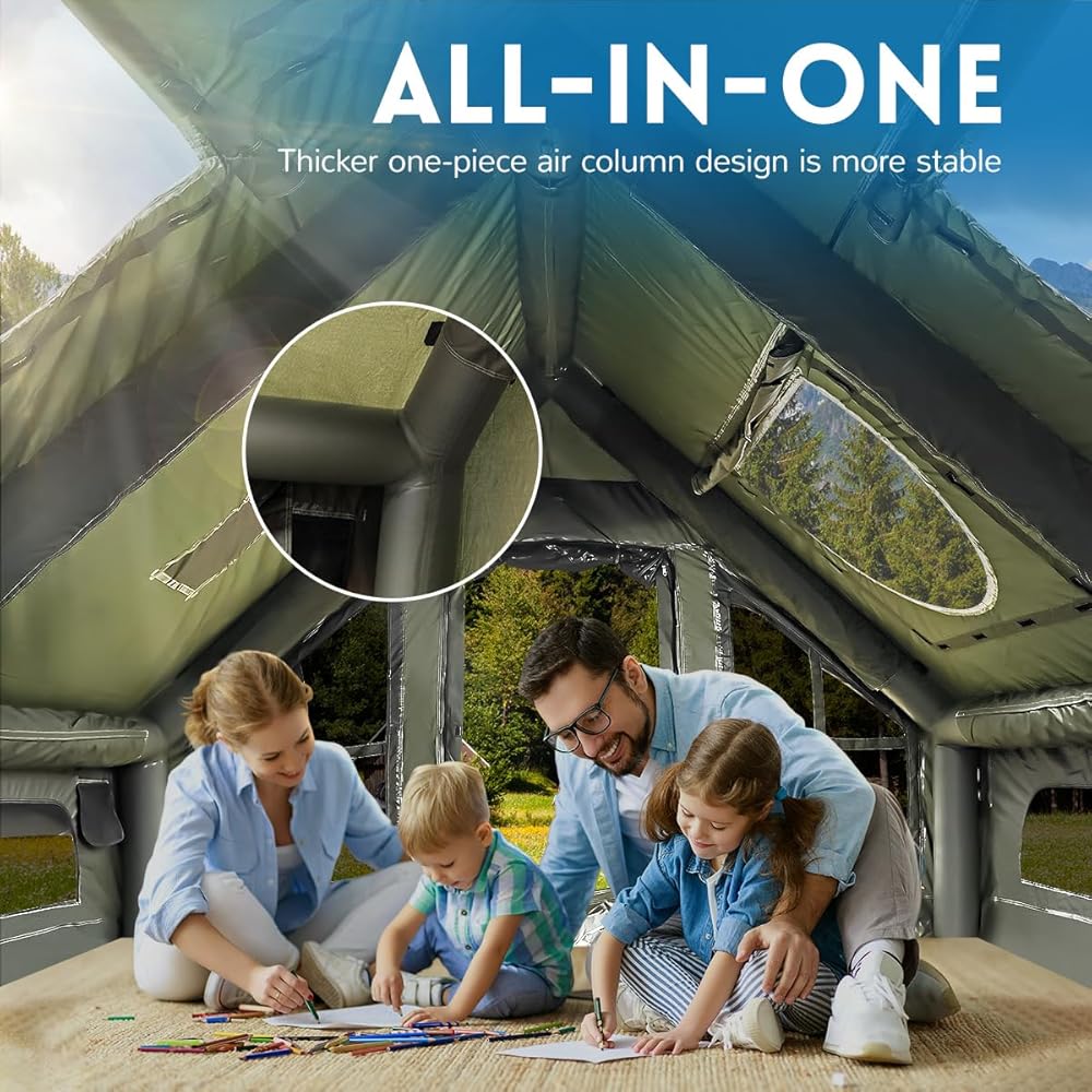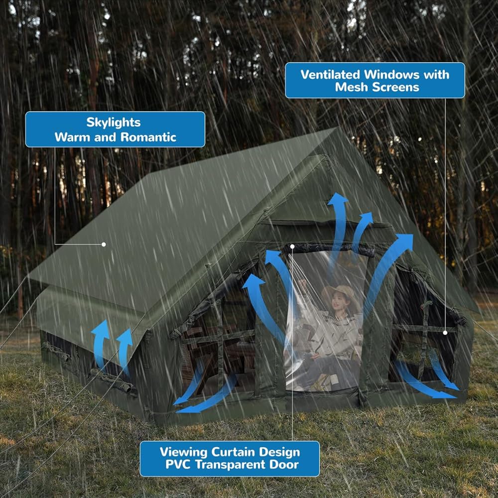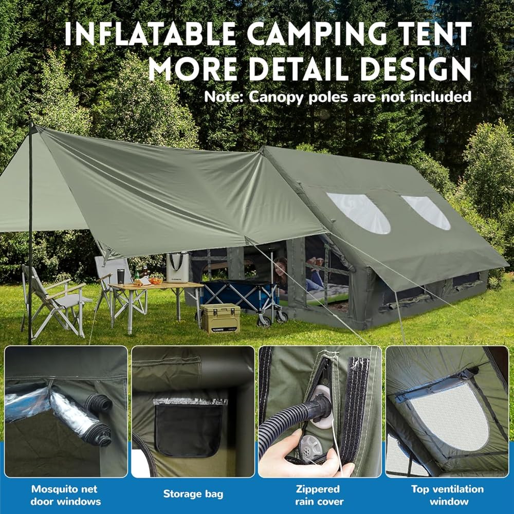 【مريحة وتهوية】تم تصميم هذه الخيمة المنزلية القابلة للنفخ بأبواب ونوافذ شبكية لضمان عدم انسداد التهوية ثلاثية الأبعاد متعددة الاتجاهات، كما أن الرؤية أكثر انفتاحًا. تأتي خيمة التخييم هذه بمظلة إضافية. يمكنه مقاومة الماء بشكل أفضل ويمنع الأشعة فوق البنفسجية بشكل جيد. استمتع بتجربة تخييم خالية من المتاعب مع خيمة التخييم القابلة للنفخ! (ملاحظة: أعمدة المظلة غير متضمنة.)