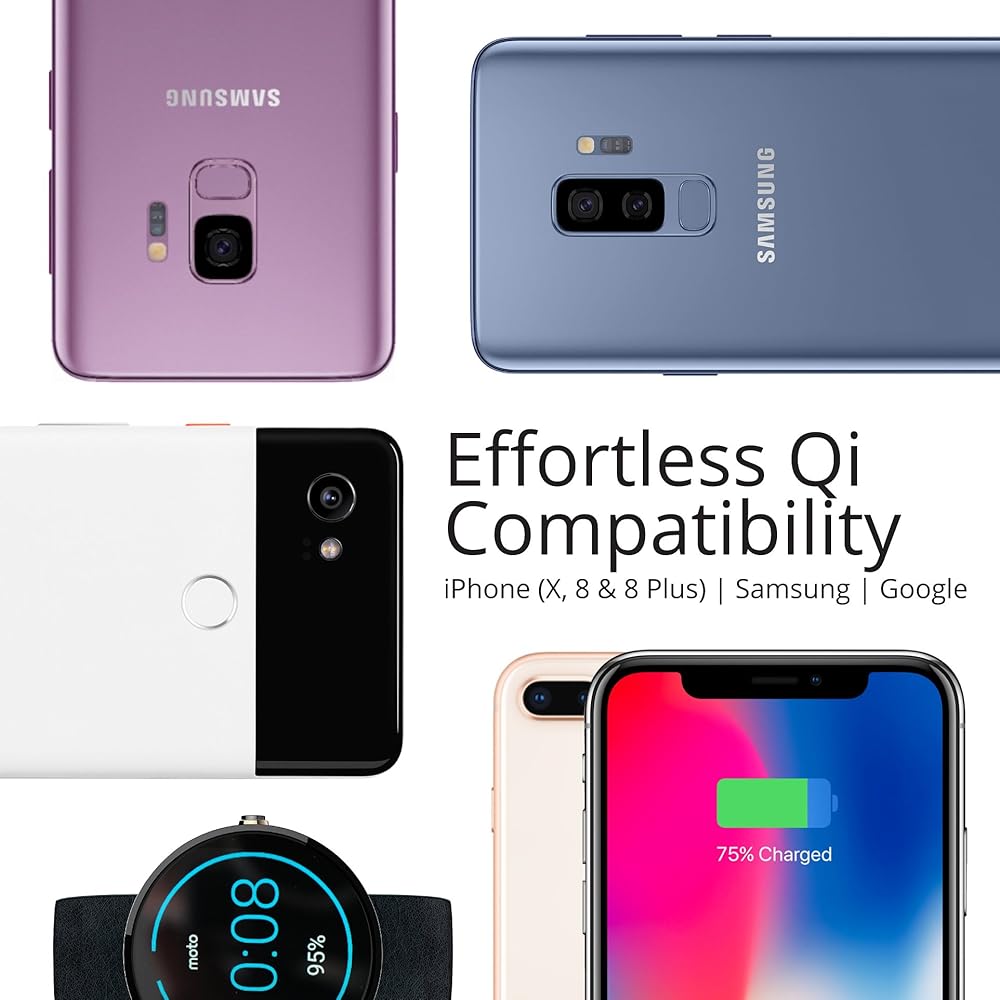 • ما الذي تتوقعه: يرجى ملاحظة أن الشحن اللاسلكي أبطأ بشكل عام من الشحن السلكي ولكنه في المقابل يحمي منفذ الشحن الخاص بجهازك ويطيل عمر البطارية. يتميز حامل الشاحن هذا بمخرج طاقة بقوة 15 واط. يمكن أن تحصل هواتف سامسونج المحددة على ما يصل إلى 15 واط من الطاقة، في حين أن أجهزة iPhone 8/8+/X قادرة حاليًا على تلقي ما يصل إلى 7.5 واط من الطاقة. سيستغرق هاتف iPhone 8+/ X حوالي 3 ساعات للشحن الكامل وحوالي ساعتين لجهاز iPhone 8.