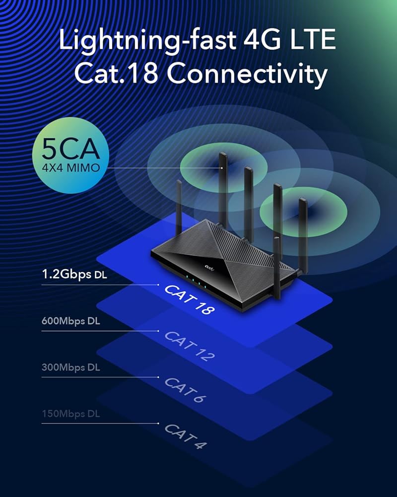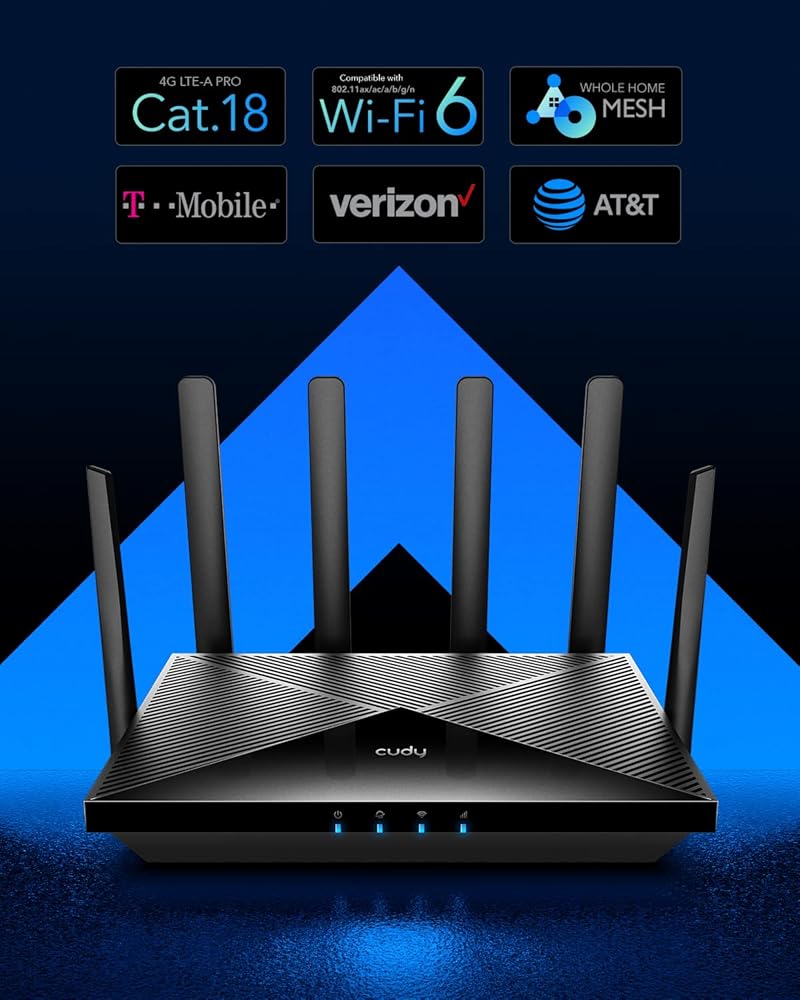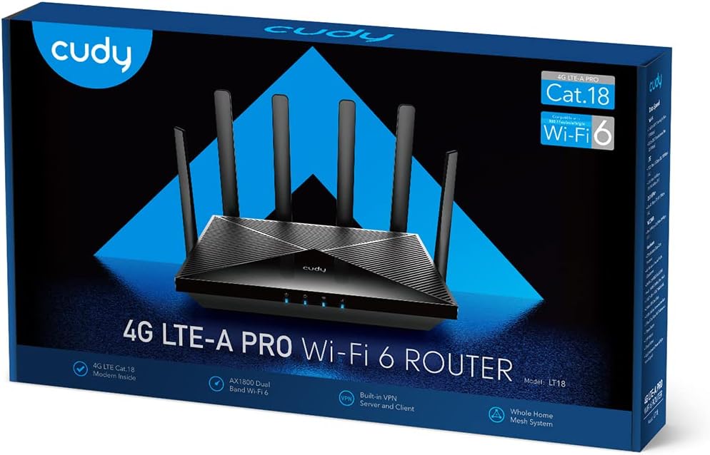 جهاز توجيه Cudy الجديد 4G LTE Cat 18 WiFi 6، مودم 4G LTE بسرعة تصل إلى 1.2 جيجابت في الثانية، مجموعة شرائح Qualcomm، 4 x 4 MIMO، AX1800، OpenVPN، Wireguard، Zerotier، Cloudflare، IPv6، هوائيات قابلة للفصل، ثنائي الشريحة، LT18