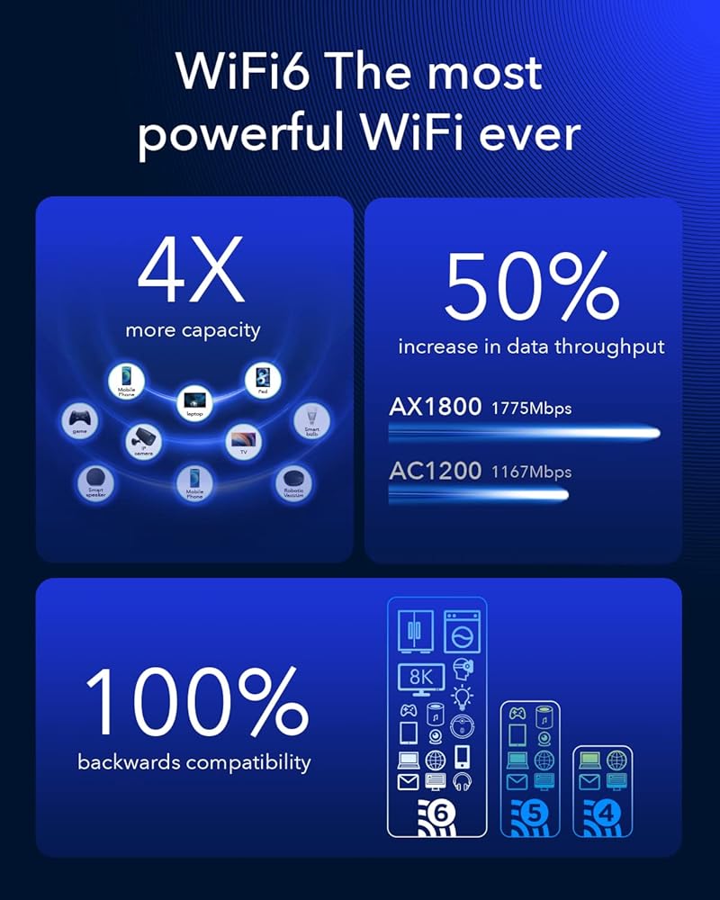الجيل التالي من شبكة WiFi 6. يوفر شبكة Wi-Fi مزدوجة النطاق فائقة السرعة بسرعات تصل إلى 1201 ميجابت في الثانية على نطاق 5 جيجاهرتز و574 ميجابت في الثانية على نطاق 2.4 جيجاهرتز. يتيح الأداء اللاسلكي الاستثنائي ممارسة الألعاب عبر الإنترنت وبث الفيديو عالي الدقة في نفس الوقت، بينما يمكن مشاركة الملفات الكبيرة مع أجهزة متعددة.