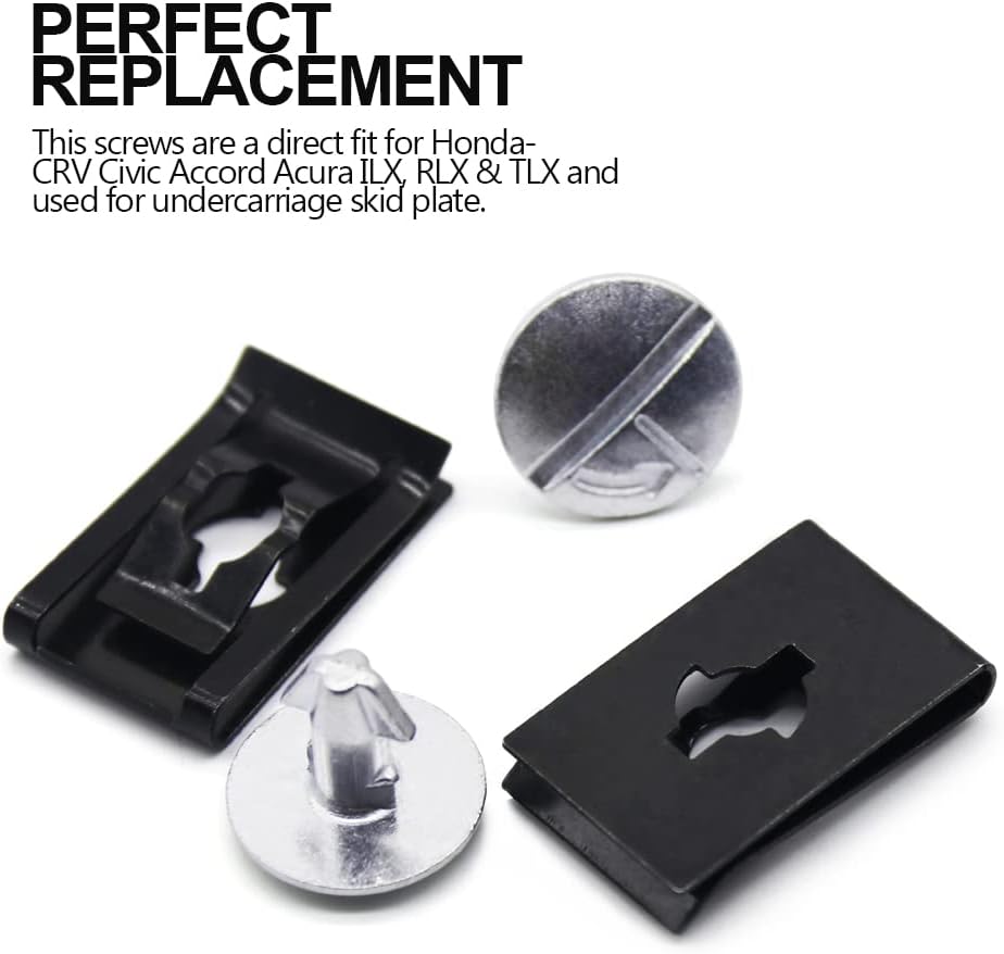 The specialty screws are a direct fit for Honda CRV Civic Accord Acura ILX, RLX & TLX. The screws are used for undercarriage skid plate.
