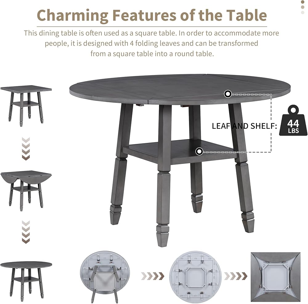Folding Dining Table - This dining table is often used as a square table. In order to accommodate more people, it is designed with 4 folding leaves and can be transformed from a square table into a round table, and the folding leaf has a load-bearing capacity of 44lbs. After the folding leaf is put down, it can be fixed under the table to leave room for your legs. The fixed shelf at the bottom of the table can be used to store small items such as decorative ornaments, paper towels, etc.
