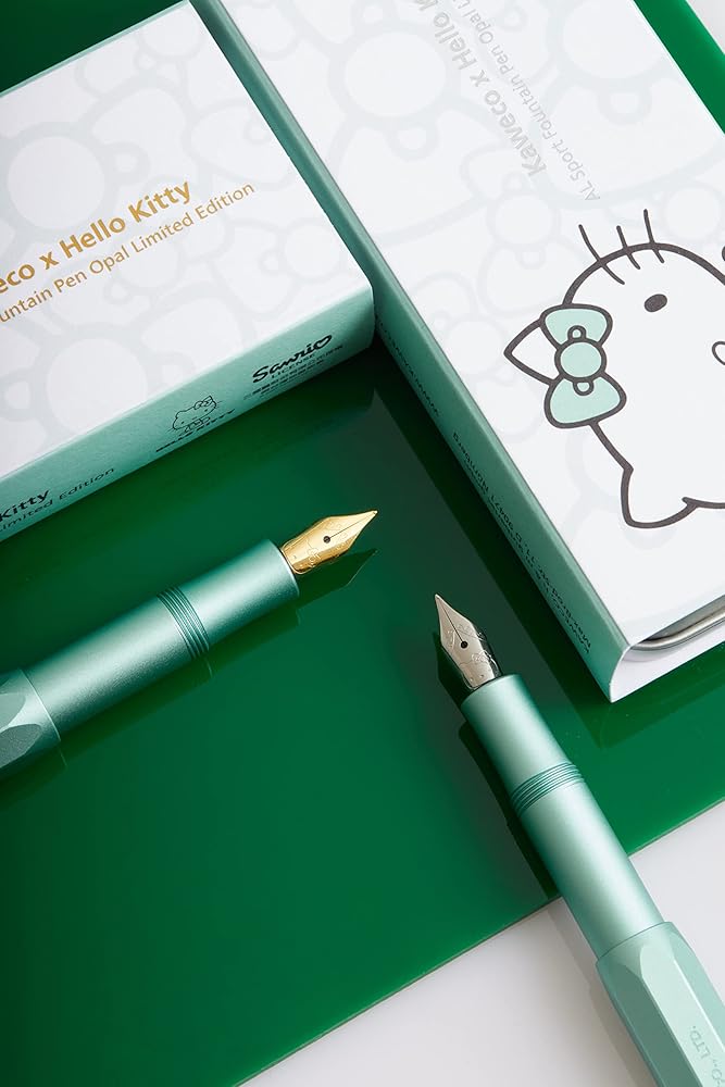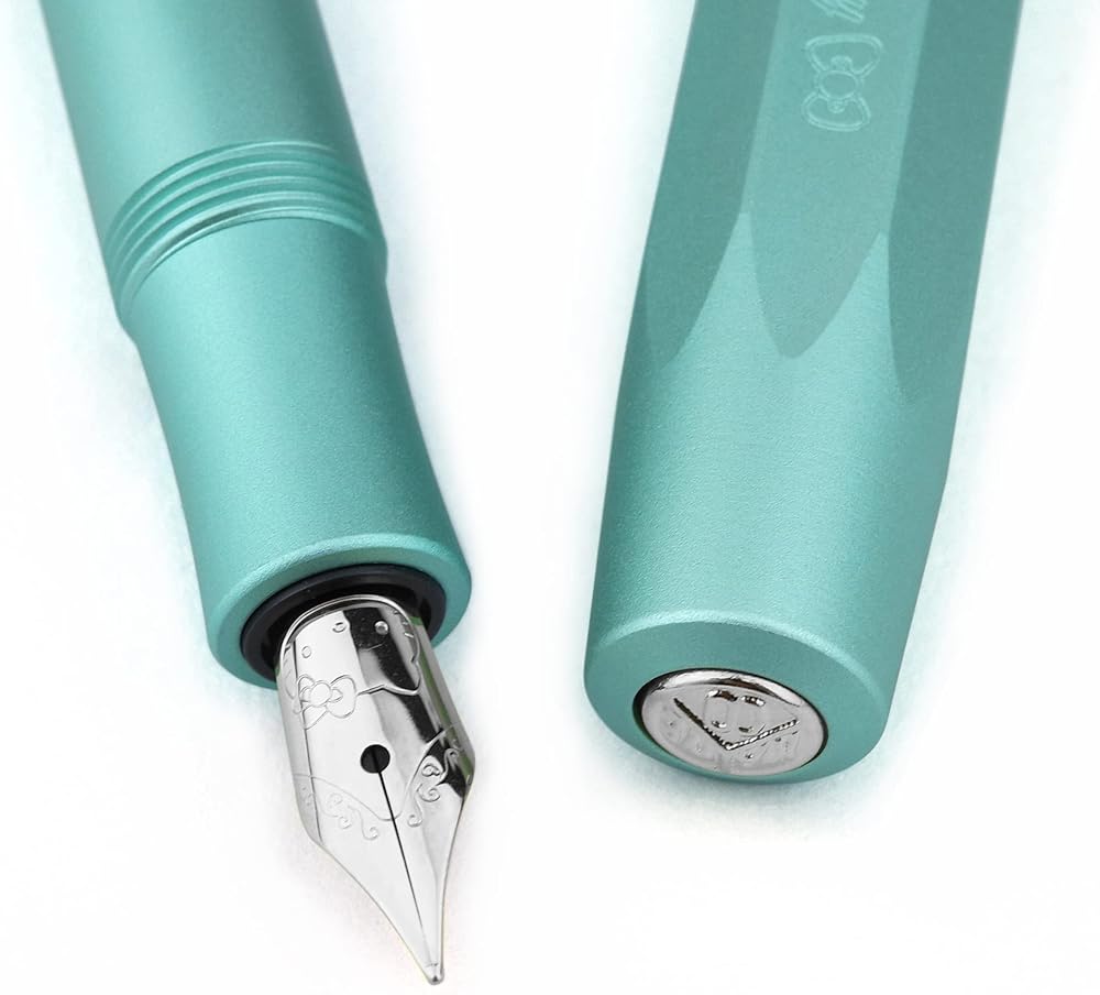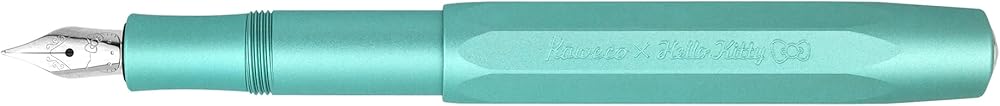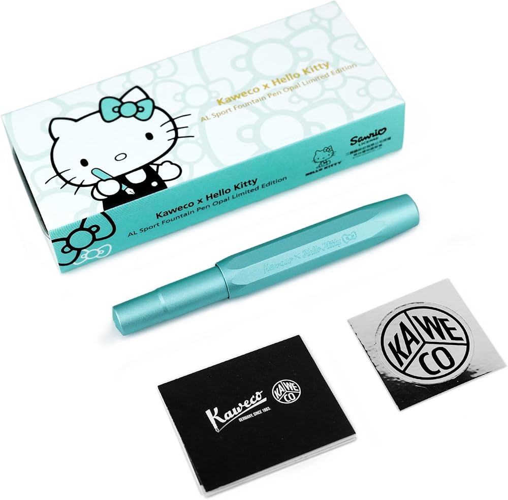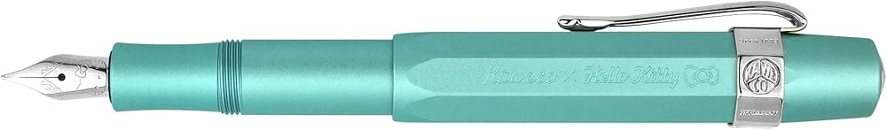 The pen features a screw-on cap for extra security, a Jowo made stainless steel nib F with the face of Hello Kitty mechanically stamped onto the nib plate, and a chrome-plated metal Kaweco logo on the cap tip