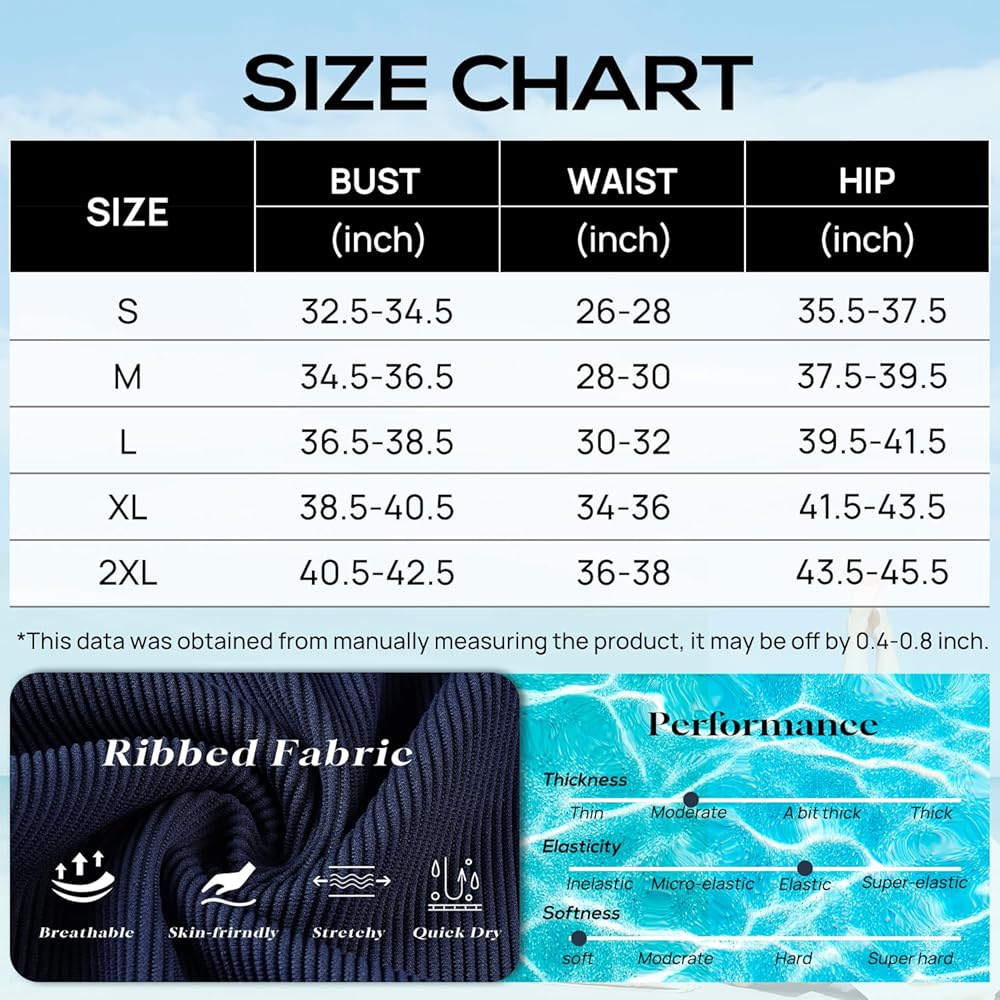 دليل المقاسات: تأكد من المقاس المثالي مع ملابس السباحة النسائية لدينا من خلال الرجوع إلى جدول مقاسات علامتنا التجارية، المتوفر في الصورة الأخيرة أو على أمازون. اختر مقاسك بعناية لتستمتع بالراحة والأناقة المطلقة.