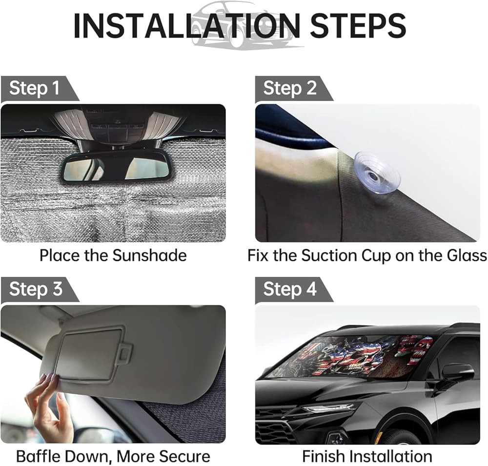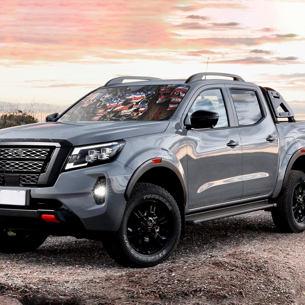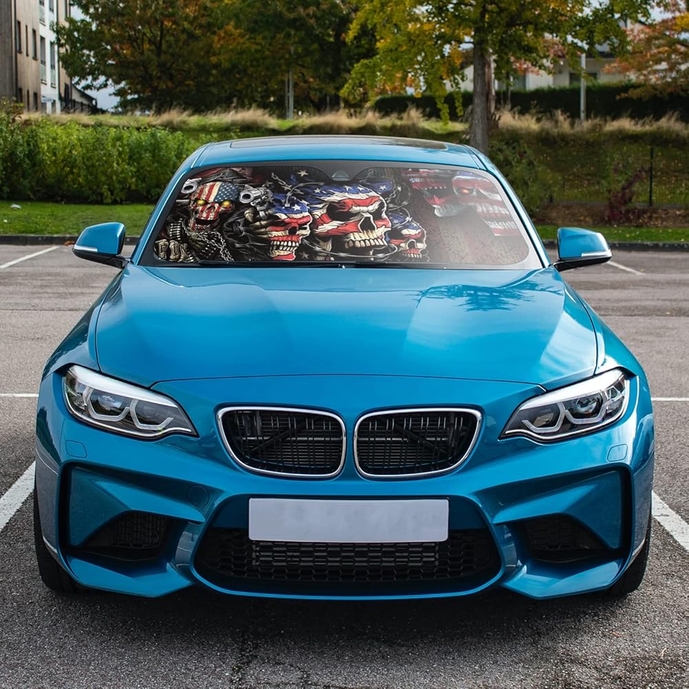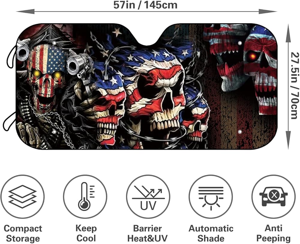 جماجم العلم الأمريكي تناسب معظم السيارات وسيارات الدفع الرباعي والشاحنات وحاجب الشمس الأمامي القابل للطي يمكن أن يحجب الأشعة فوق البنفسجية ويحافظ على برودة سيارتك - 57 × 27 بوصة